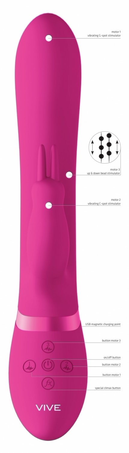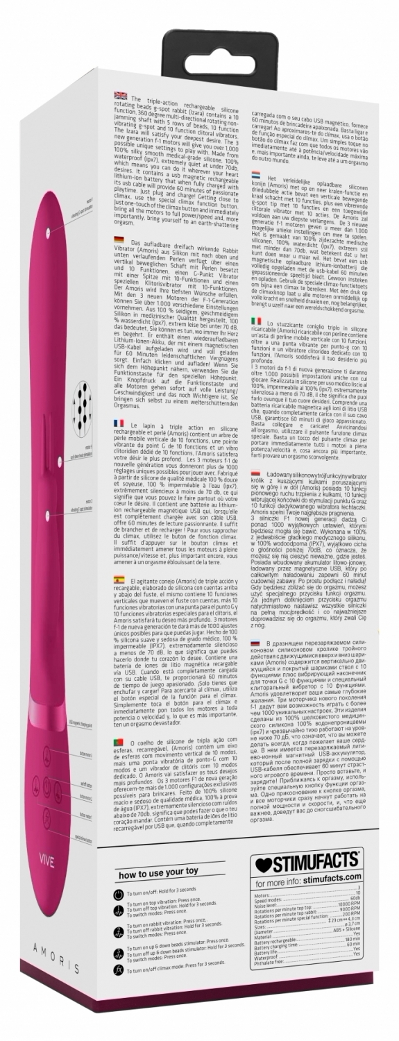 Amoris este un vibrator rabbit atrăgător, cu mărgele. Cu un ax cu mărgele vertical, cu 10 funcții, un vârf vibrator pentru punctul G cu 10 funcții și un vibrator pentru clitoris dedicat cu 10 funcții, Amoris va satisface toate nevoile dvs sexuale.