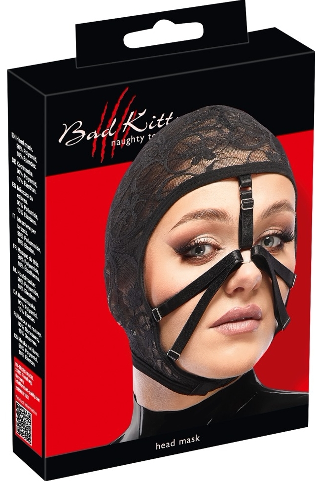 Mască de cap din volănaș neagră Bad Kitty prezintă un design grațios și bizar. Construită dintr-o dantelă fină și elastică, se fixează ușor pe cap, asigurând un confort sporit. Este dotată cu bretele înguste ajustabile, acceptând fața descoperită, creând astfel un aspect unic și neobișnuit. Compoziția materialului este 90% poliamidă și 10% spandex.