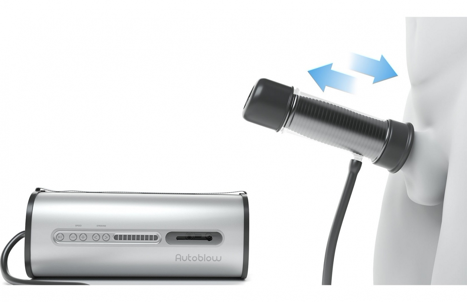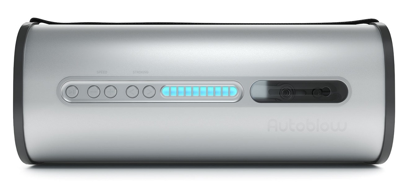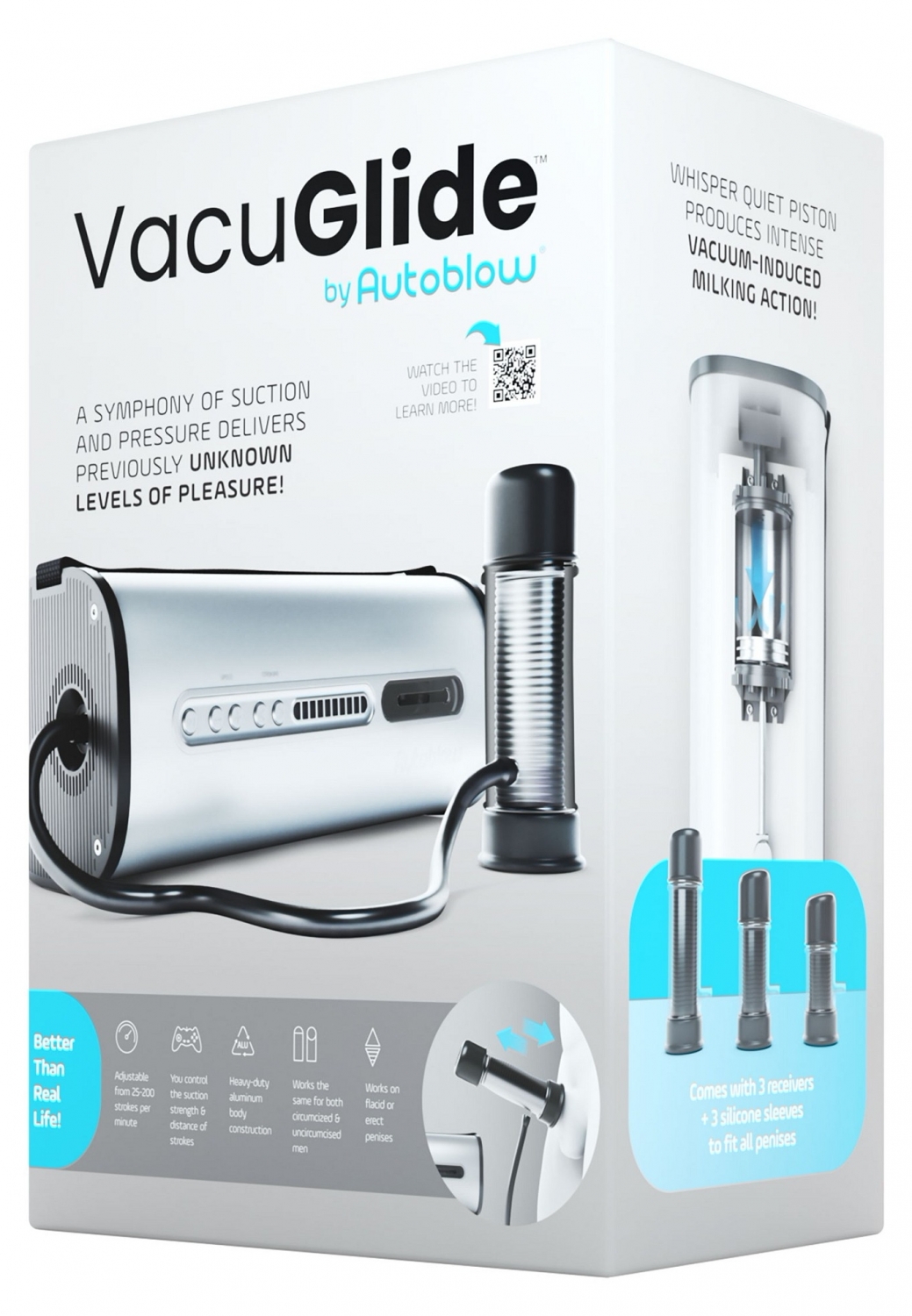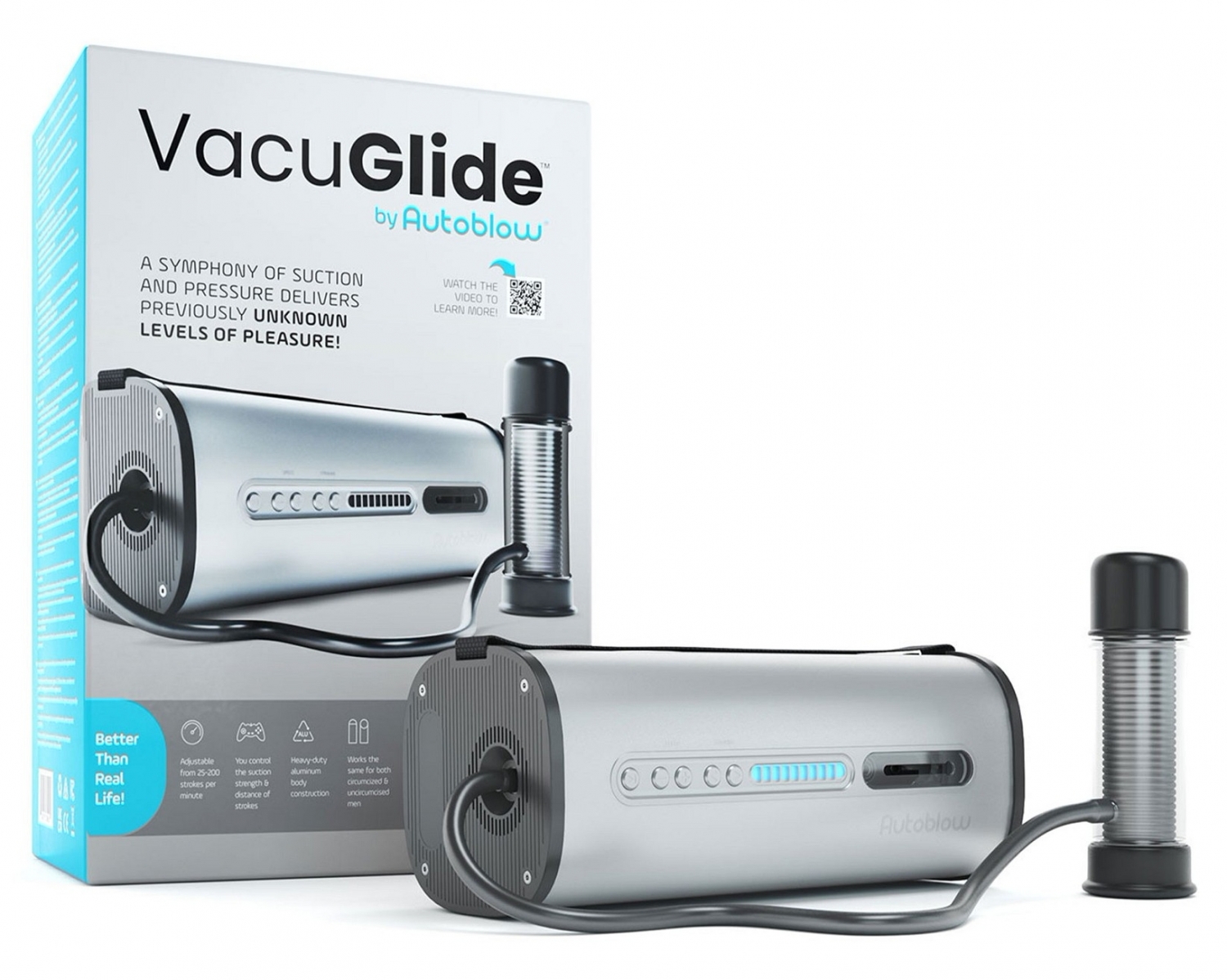 Mașina profesională Autoblow VacuGLIDE, carcasă din aluminiu extrudat, greutate robustă, trei dimensiuni de receptoare și reglaj al distanței de mișcare. Valve electronice pentru ajustare a nivelului de aspirație. Livrată cu rucsac discret; funcționare silențioasă.