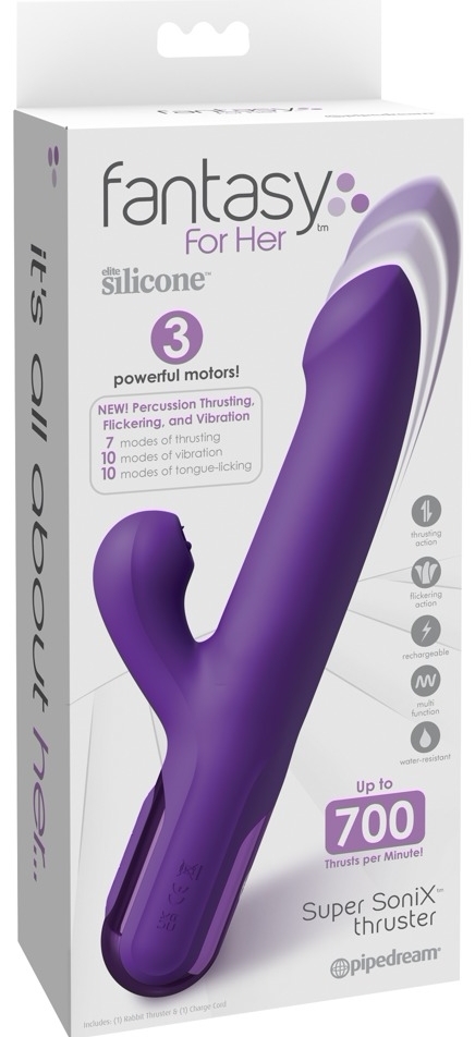 Super Sonix Thruster de la Fantezie For Her este un vibrator rabbit reîncărcabil, realizat pentru stimulare internă și externă simultană. Carcasă din silicon delicat și cele trei motoare silențioase dă un echilibru între confort și eficiență, menținând utilizarea discretă.