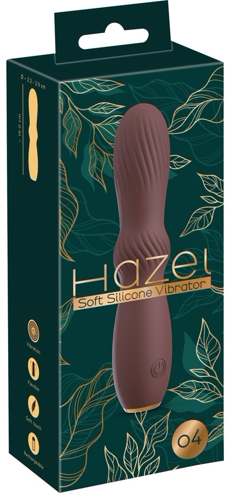 Hazel 04 este un vibrator compact, cu cap maleabil și 10 moduri de vibrație. Suprafață moale din silicon, cu acumulator prin USB și ușor de purtat. Lungime 15 cm (introducere 12 cm), diametru 2,2–2,9 cm, greutate 89 g.