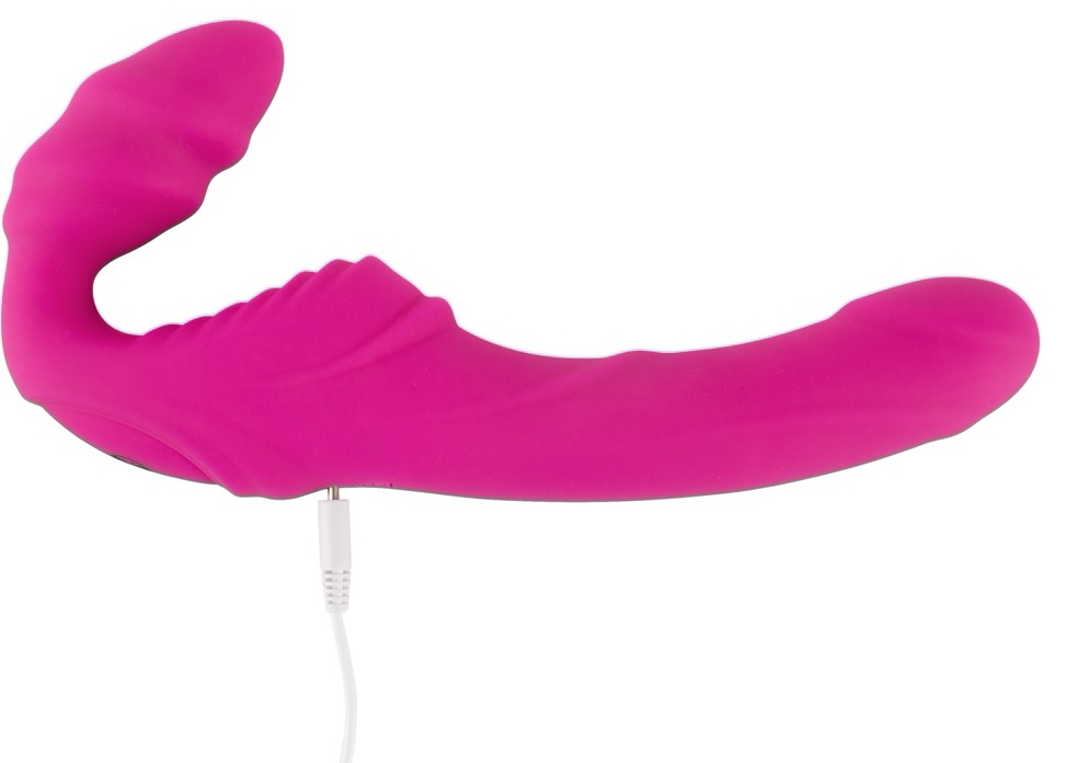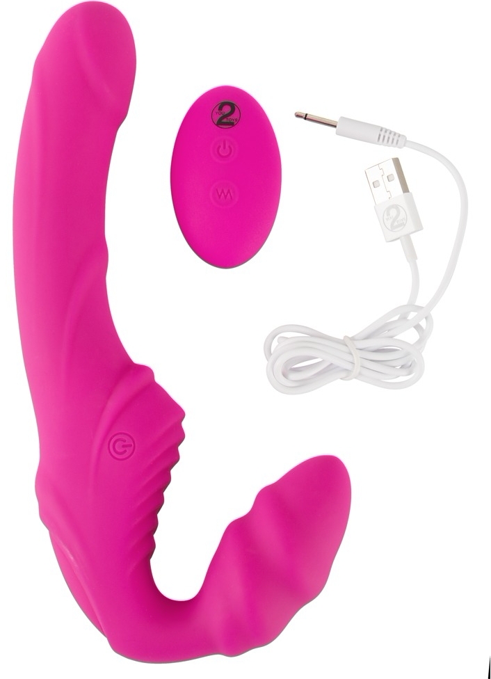 Strapless Strap On cu două vibratoare flexibile pentru delectare partajată sau individuală. 9 moduri de vibrație comandate cu telecomandă (rază 5 m). Reîncărcabil, conține cablu USB și baterie CR2032 pentru telecomandă. Soft-touch, robust la apă, greutate aprox. 230 g.