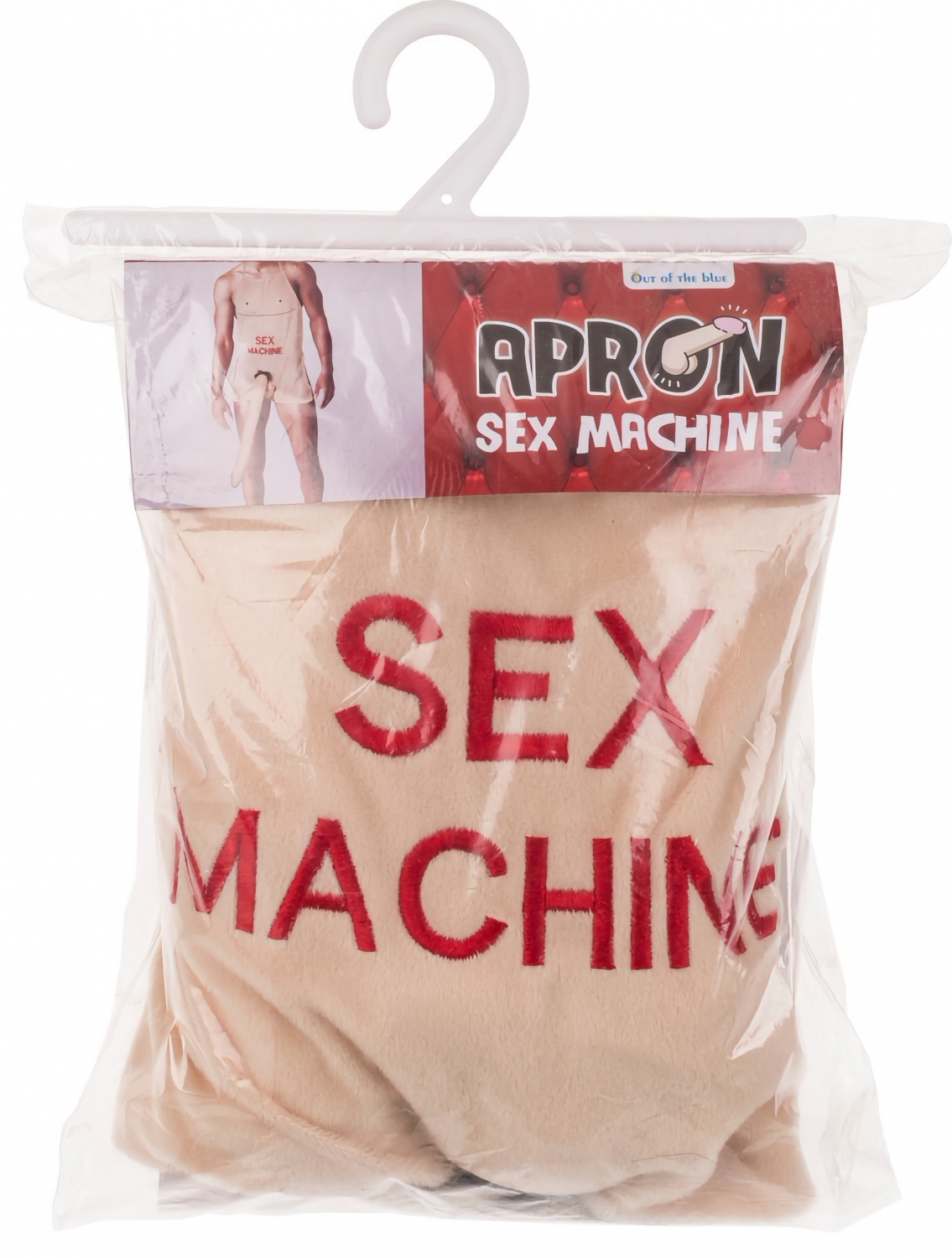 Șorț halter, bej deschis cu imprimeu roșu 'Sex Machine' și accesoriu din pluș în expresie anatomică, lung 52 cm. Protejează hainele la gătit și asigură o notă jucăușă la petreceri. Spălare manuală; prinde departe de foc.