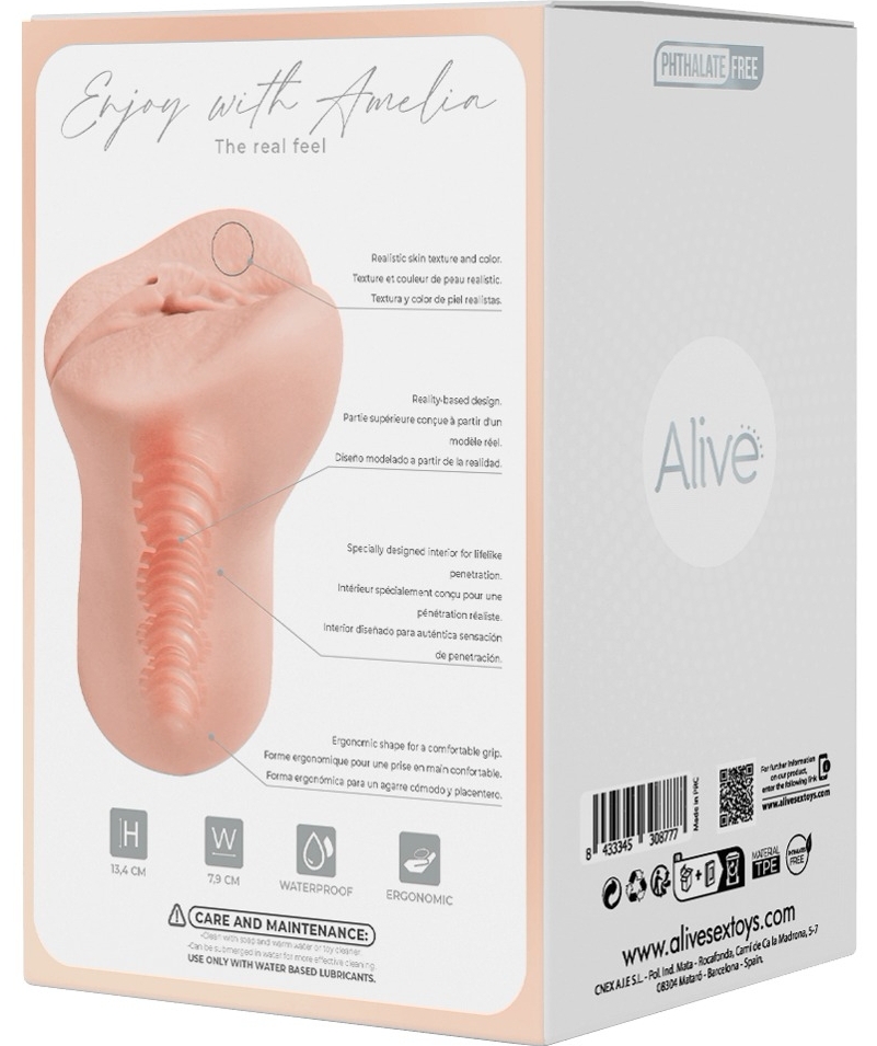 Alive Amelia este un masturbator discret din material TPE catifelat, proiectat pentru utilizare confortabilă și controlată. Materialul neted furnizează o senzație plăcută la atingere, iar carcasa ergonomică garantează prindere stabilă și manevrare ușoară.