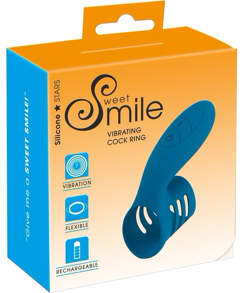 Inel vibrant Sweet Smile din silicon moale, cu stimulator orientabil și 7 chipuri de vibrație. Reîncărcabil, include cablu USB; design flexibil extra-lat pentru potrivire comodă și stimulare externă direcționabilă.