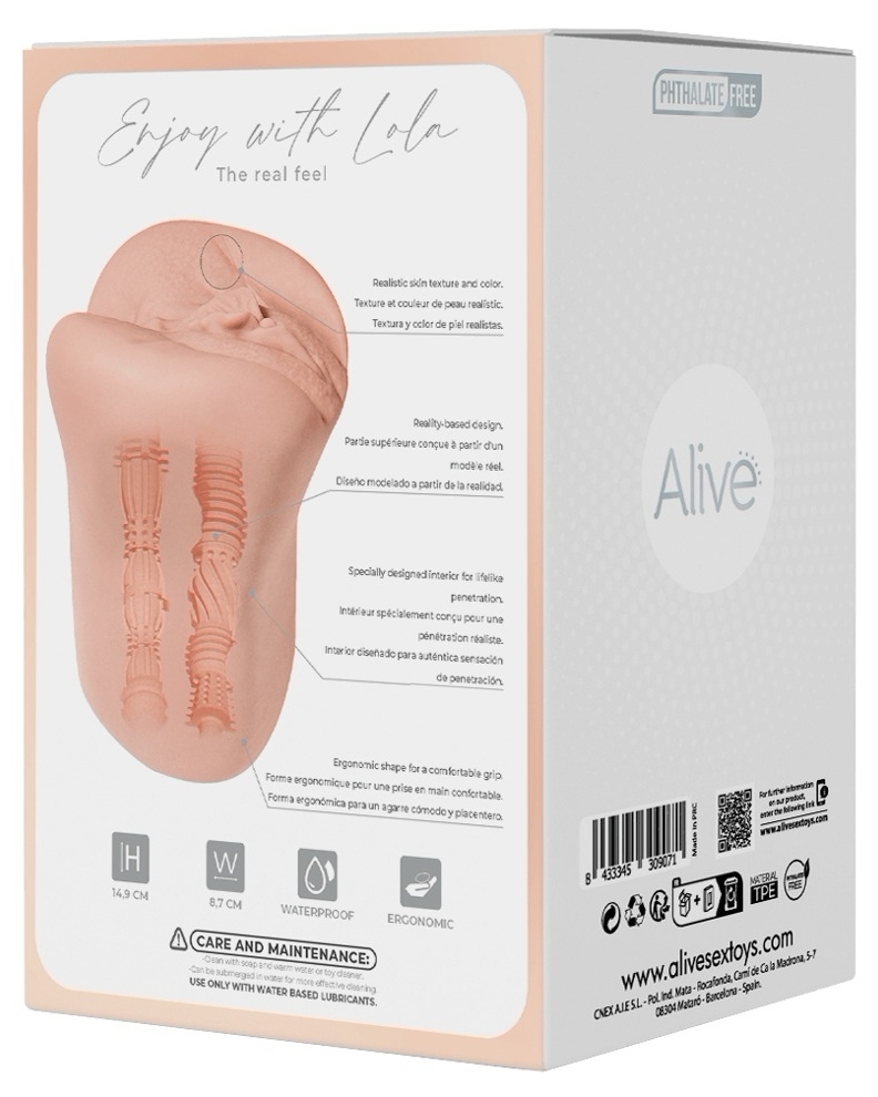 Alive Lola, masturbator compact din TPE moale, dă textura pielii și canale interioare striate pentru frecție intens. Mâner ergonomic, capăt deschis pentru curățare ușoară. Lungime întreagă 14.9 cm, portabil și discret.