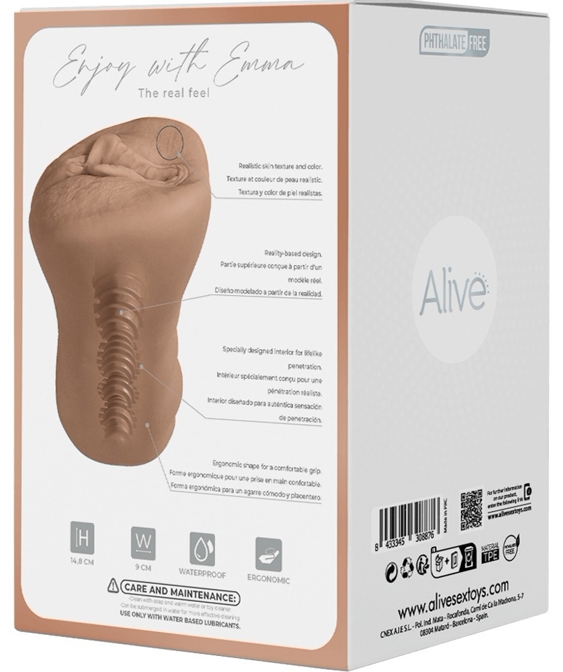 Masturbator compact Alive Emma din TPE moale, interior texturat cu canale pentru stimulare puternică și senzație strânsă. Design ergonomic, punct final deschis pentru adaptare la lungimi diferite și curățare facilă.