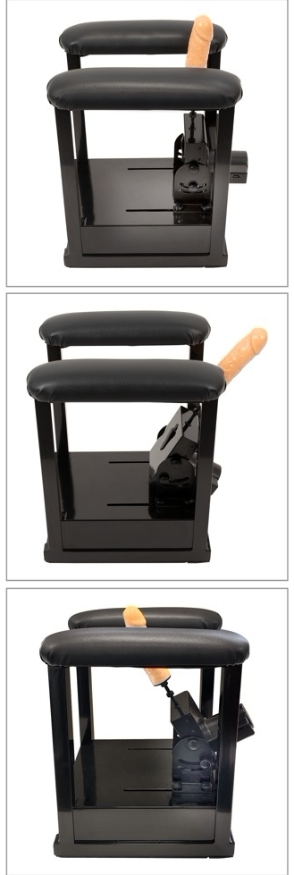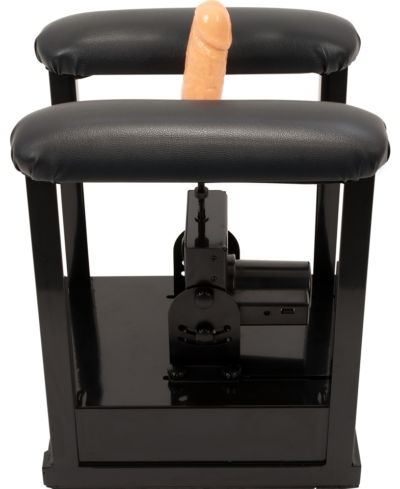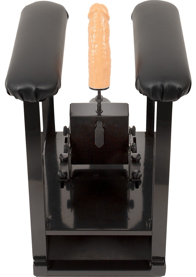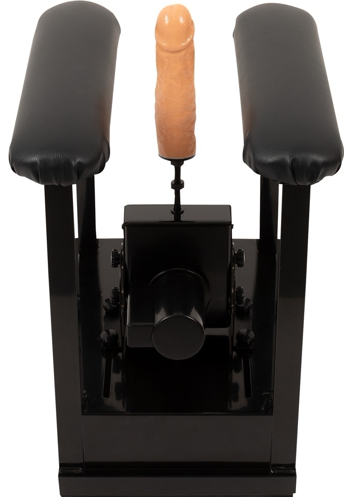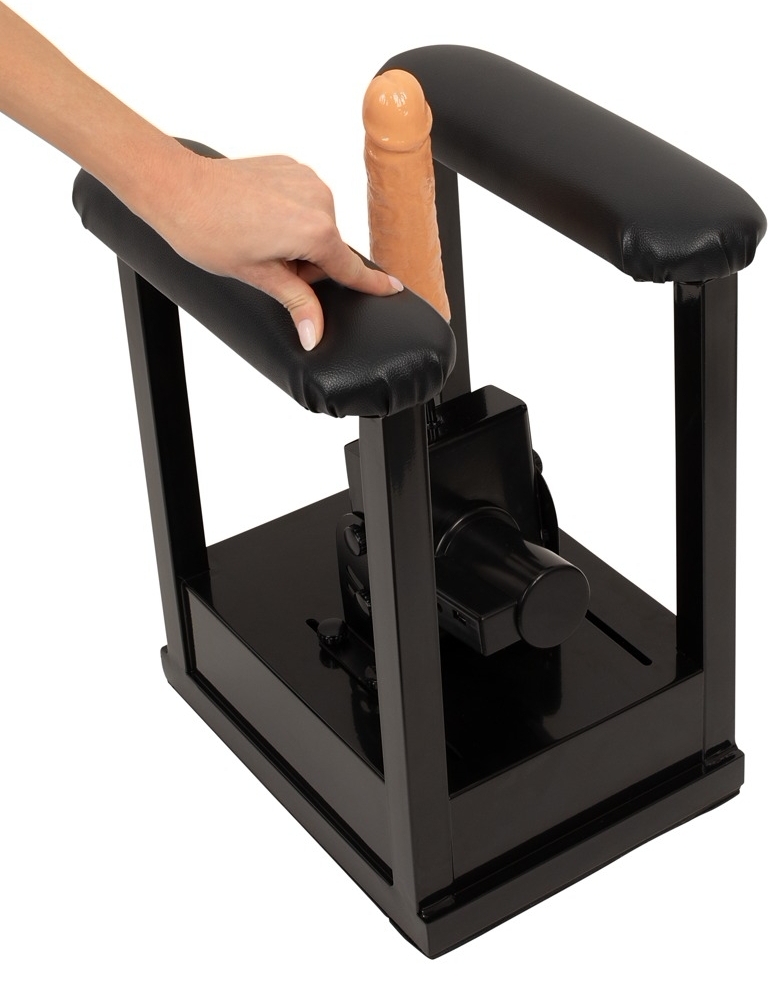 Mașină Sit-On stabilă, alimentare la priză. Braț reglabil cu impulsuri până la 8 cm, dildo realist TPE (18 cm, Ø 4.8 cm), telecomandă cu fir 1,83 m și perne căptușite. Ajustări cu cheie Allen; adaptor inclus.