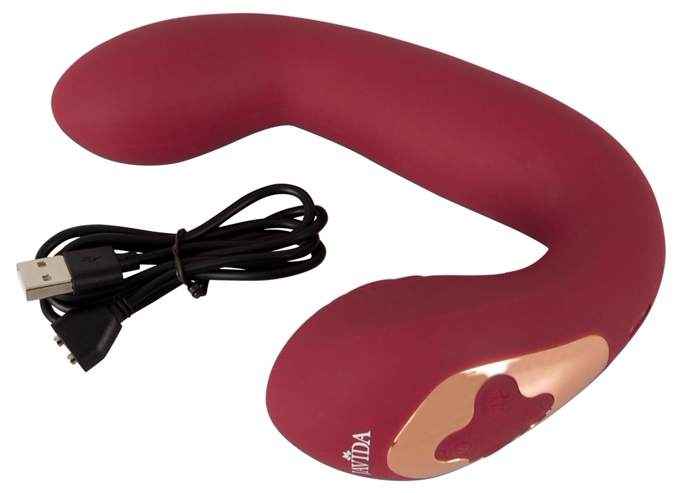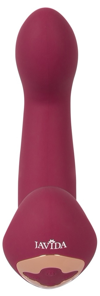 Vibrator rabbit JAVIDA cu 10 feluri de pulsații și ciocănit, funcții combinate și buton Turbo. Trei motoare puternice și foarte silențioase. Este îndoit pentru stârnire punctului G, silicon catifelat, cu acumulator cu cablu magnetic USB. Lungime 17,1 cm, inserare 14,2 cm.