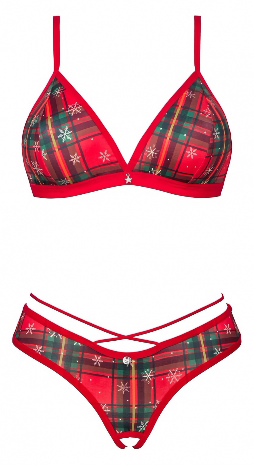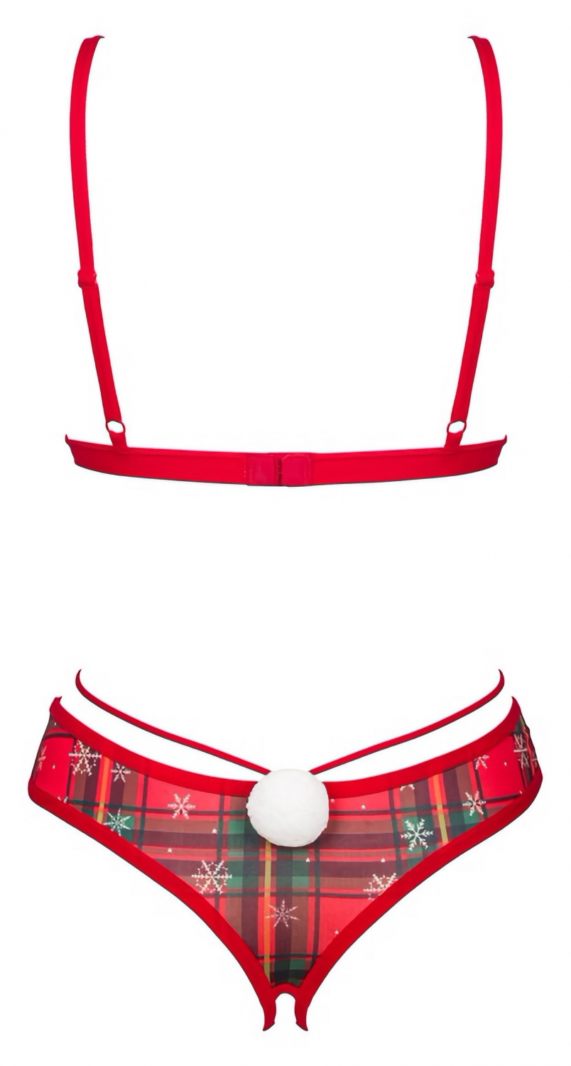 Set Ms. Merrilo de la Obsessive: sutien excluzând armătură și chilot decupat, din tulle elastic cu tip în carouri și fulgi albi. Bretele reglabile, pandantiv aurit și pompon pufos la spate. Confort moale și potrivire elastică.