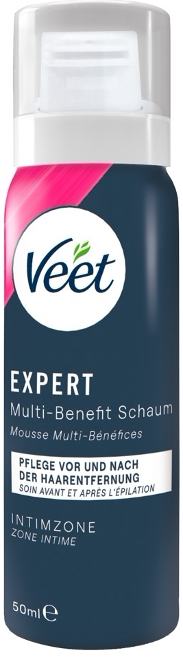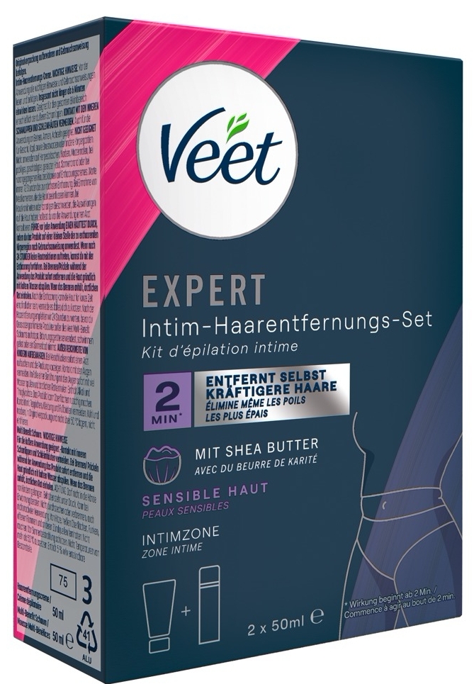 Set Veet EXPERT pentru zona intimă: alifie depilatoare 50 ml (spatulă inclusă) și spumă multifuncțională 50 ml. Îndepărtează firele groase în circa 2 minute, hidratează până la 48 ore și calmează dermă sensibilă.
