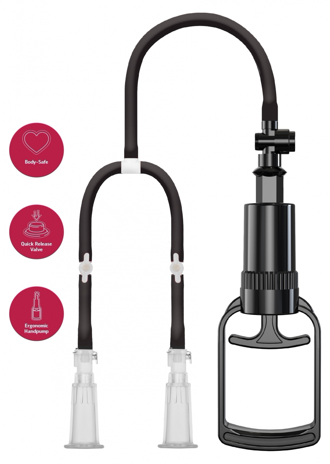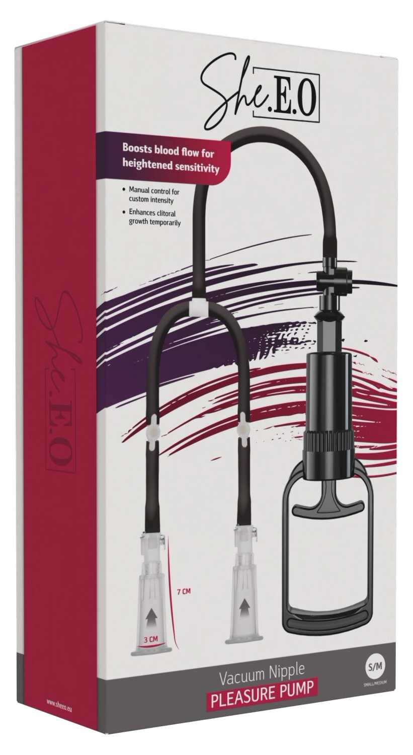 Pompiță vacuum She EO pentru stârnire a sfârcurilor: aplicare simplă, pompă manuală pentru vid controlat, supapă ce menține aspirația după îndepărtarea furtunului/pompei și eliberare rapidă. Crește sensibilitatea și senzațiile locale.