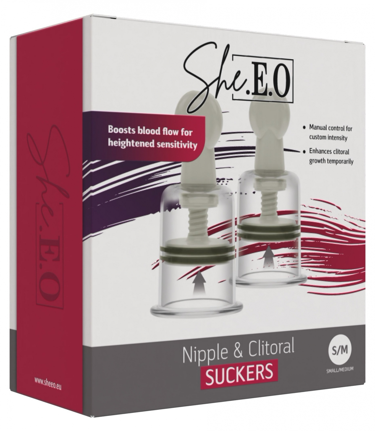 Ventuze She EO cu sucțiune reglabilă: crește receptivitatea de clitoris și a mameloanelor. Inel Ø 4 cm, reglare ușoară prin capac rotativ. Aplicare simplă și ajustare fină pentru control personalizat.