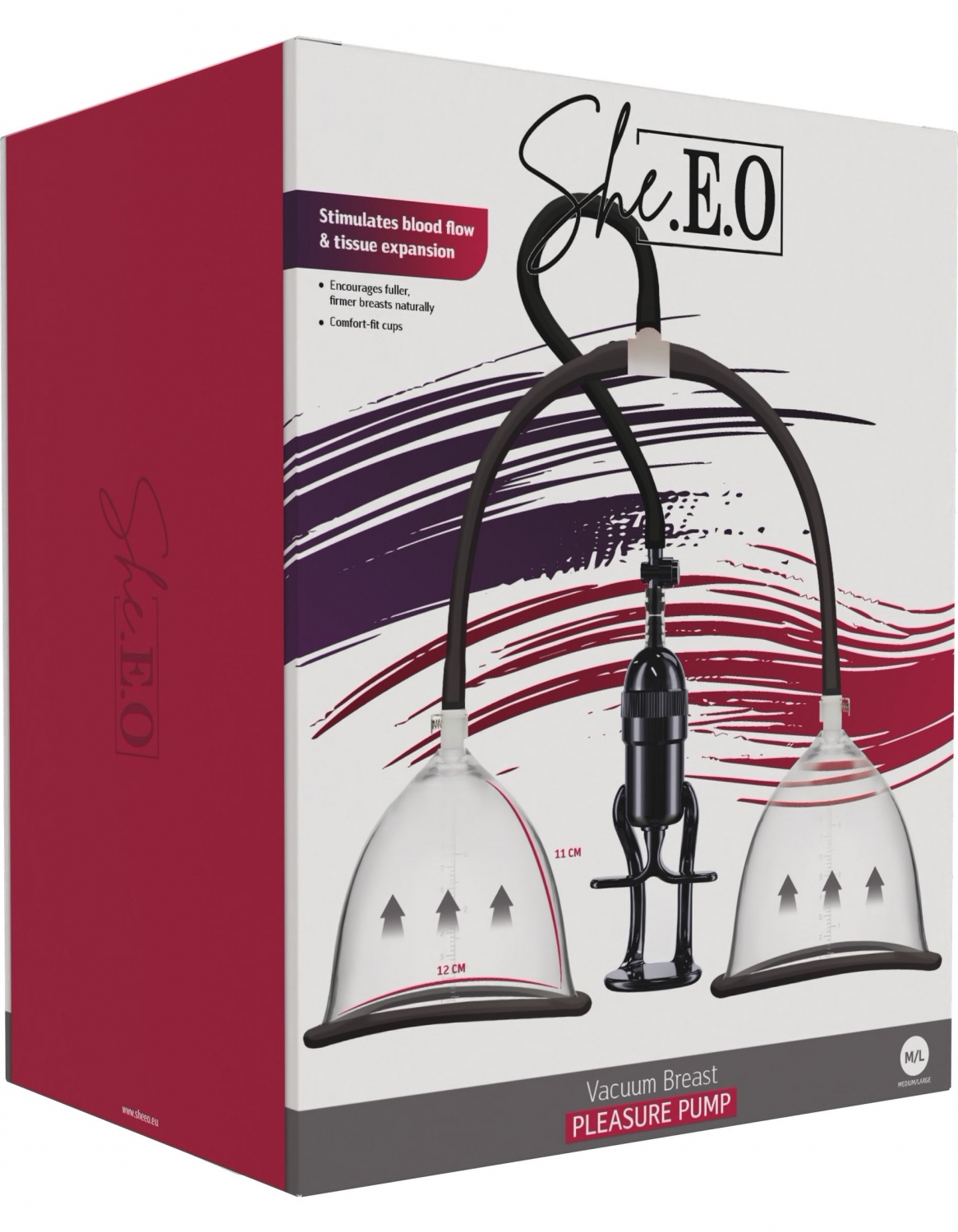 Pompă vacuum She EO pentru stârnire delicată a zonei bustului. Alcătuie şi menţine vacuum datorită supapei speciale; include valve de eliberare rapidă pentru control instant. Mărimi cupă: 11×12×12 cm.
