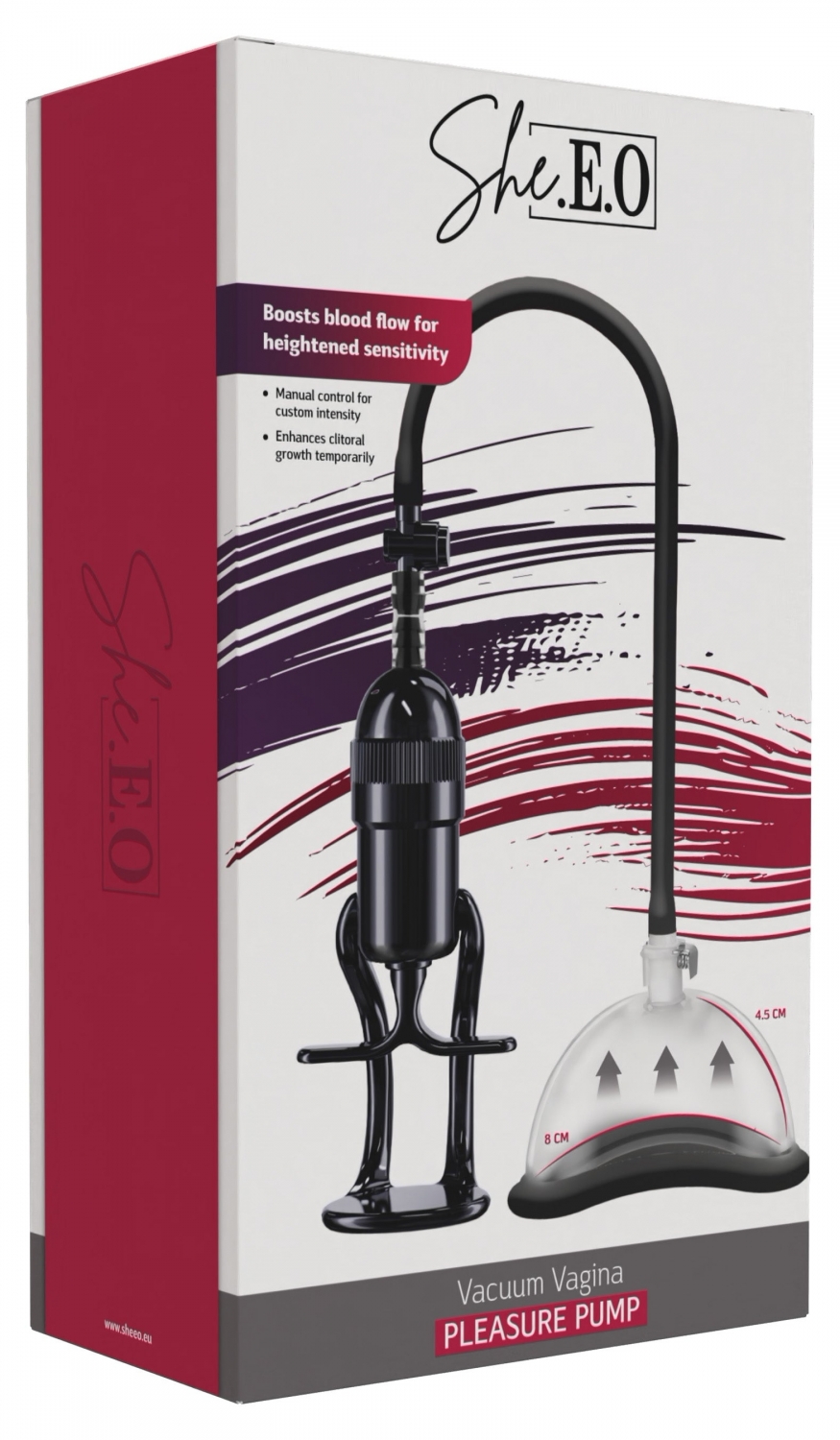 Pompa vacuum She EO pentru zona sexuală sporește sensibilitatea și intensifică senzațiile prin sucțiune delicată. Include pompiță manuală, supapă de eliberare grabnică și valvă de menținere a presiunii pentru control sigur. Cupă 4.5 x 8 cm, ring 8 cm.