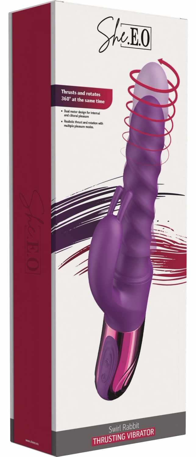 Swirl Rabbit de la She EO împreunează o rotaţie integrală de 360° cu un mecanism de împingere pentru stârnire internă puternică și ritmică. Shaftul inserabil se roteşte în jurul axei în timp ce execută mișcări sus-jos, imitând o senzație dinamică și controlabilă.