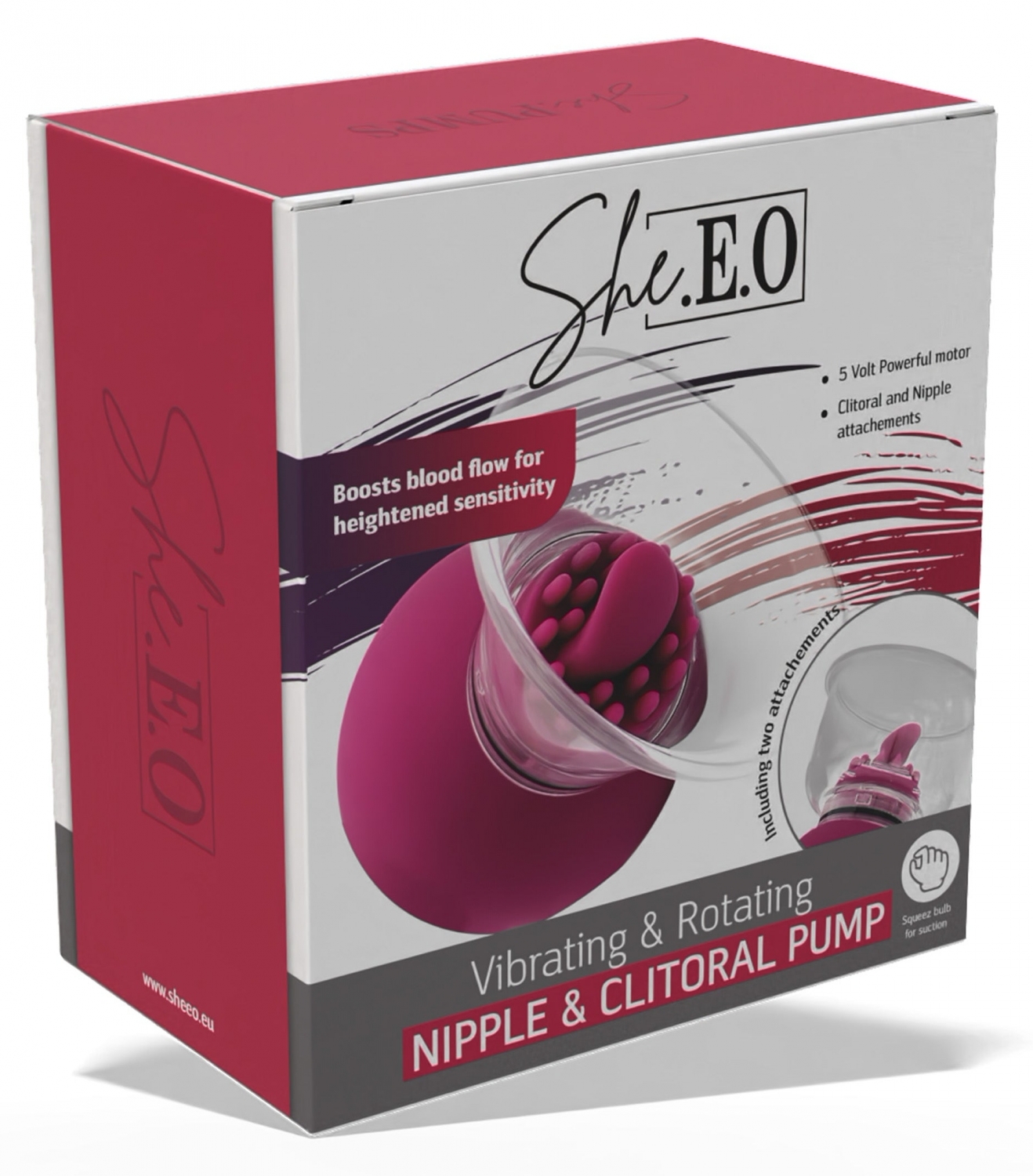 Pompa She EO Rotativă și Vibrantă transmite stimulare precisă pentru clitoris și mameloane prin două cupuri detașabile și sistem de aspirație manual. Designul compact (8 x 8 x 8 cm) comasează motorul rotativ și vibratorul pentru control fin al intensității.