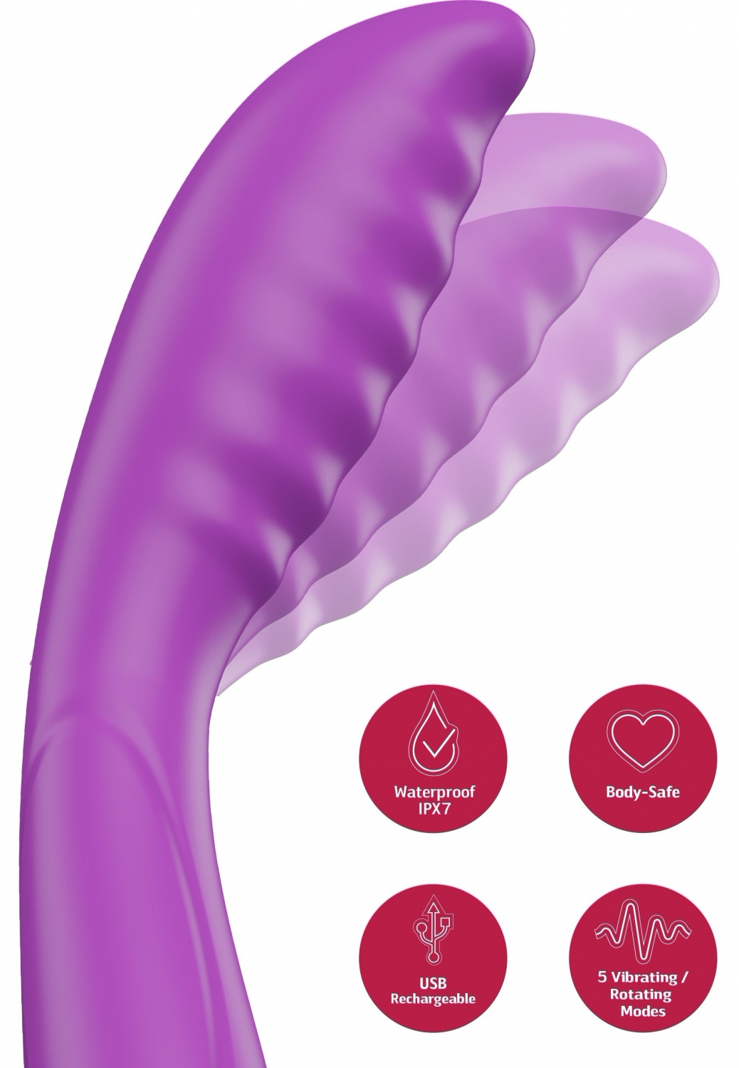 Siliconul sigur pentru corp este fin la atingere și ușor de curățat. Motorul reîncărcabil oferă 10 combinații de vibrație și tapping, pentru reglaj precis. Protecția IPX7 îl face robust la apă, pentru utilizare și curățare minus griji.