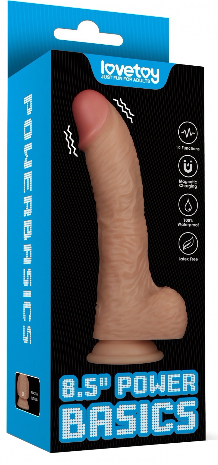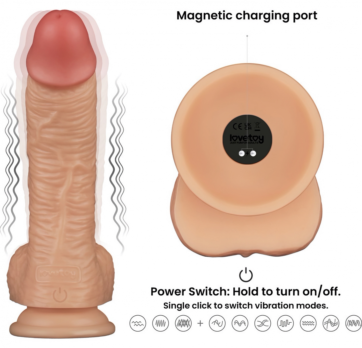 Dildo realist Lovetoy 8.5 Vibrant cu 10 chipuri de vibrații, motor silențios, reîncărcare USB magnetică și bază cu ventuză. 100% impermeabil, făcut din PVC sigur pentru corp. Lungime totală 21,6 cm, inserabil 16 cm.