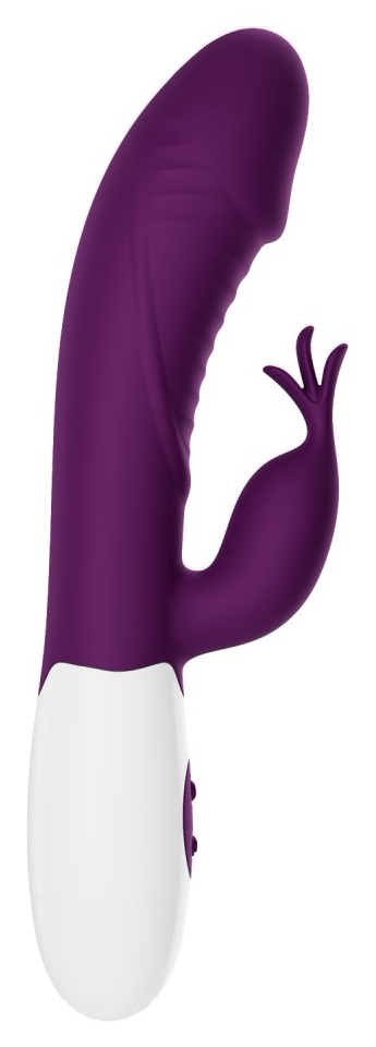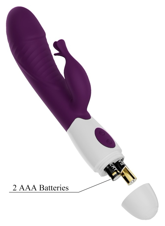 Stimulator dublu Pretty Love Rasmussen Purple: estetică flexibil ce menține raportul cu clitorisul și vizează punctul G, cu 30 de moduri de vibrație. Alimentare pe baterii și comenzi simple pentru reglaj rapid.