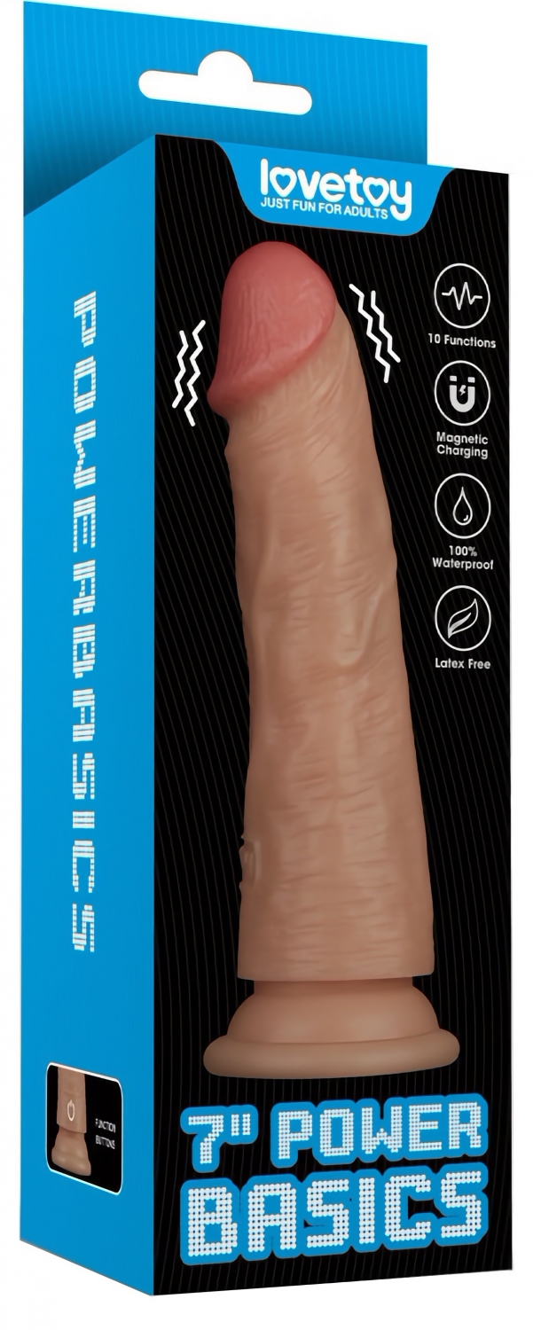 Dildo realist Lovetoy Power Basics, cu 10 moduri de vibraţii, cu acumulator USB, ventuză intensă pentru utilizare hands-free şi carcasă 100% rezistentă la apă. Motor silenţios, finisaj agreabil la atingere, corespunzător cu hamuri.