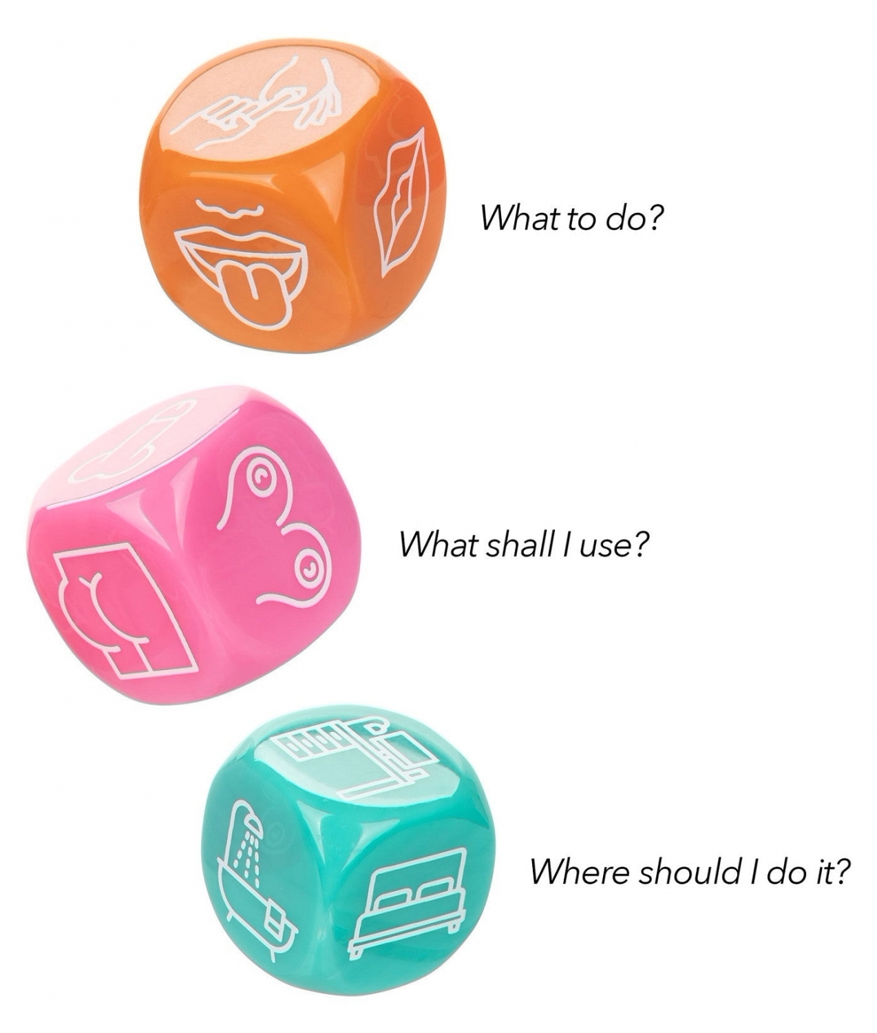 Cum se folosește: aruncați cele 3 zaruri și urmați indicațiile afișate. Produs destinat numai adulților; întrebuințați întotdeauna cu respect și consimțământ.