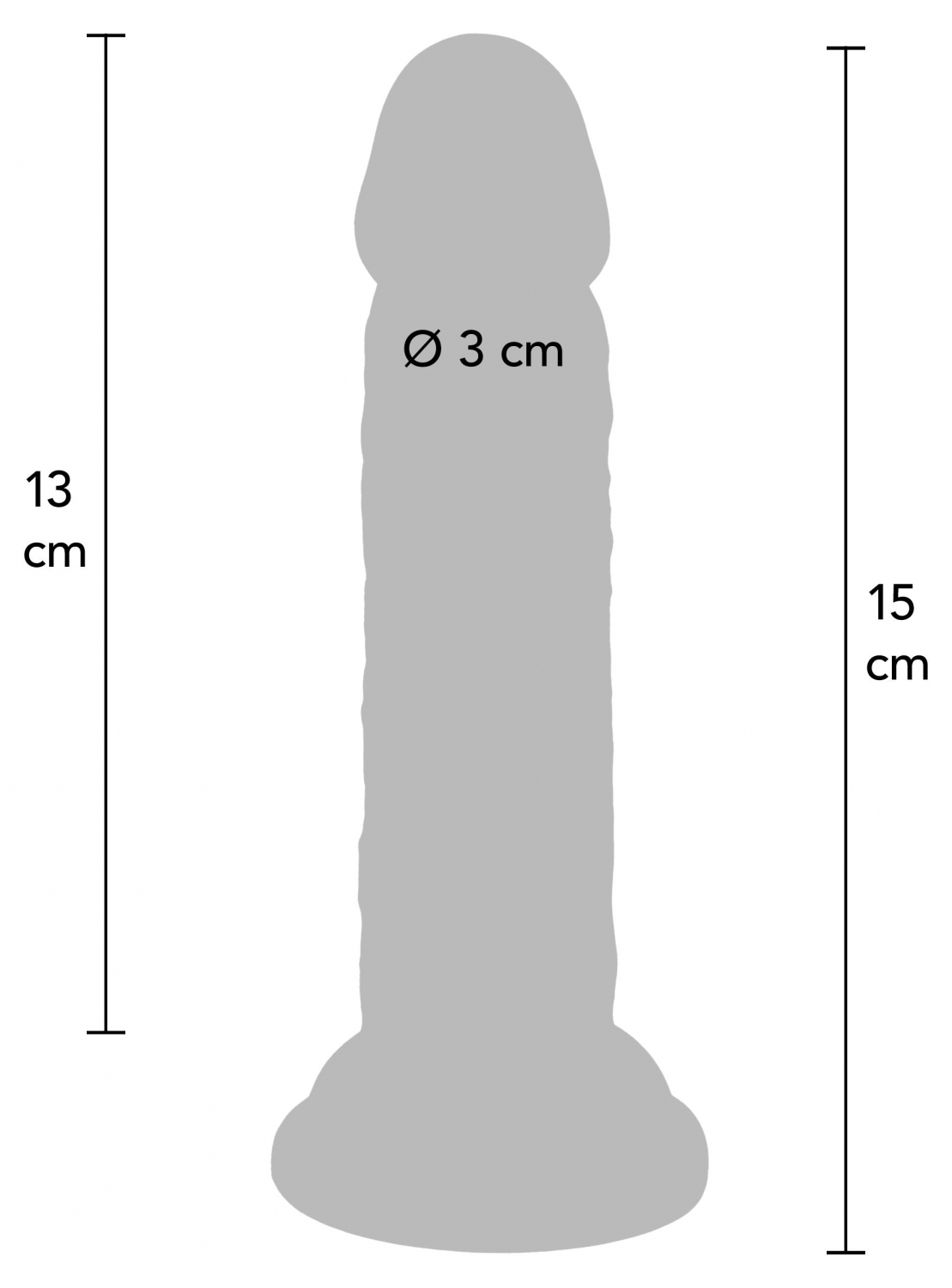 Baza cu ventuză robustă garantează fixare sigură pe suprafețe netede și permite utilizare hands‑free. Mărimile compacte fac materialul finit ușor de manevrat și depozitat: lungime totală 15 cm, extindere inserabilă 13 cm și calibru de aproximativ 3 cm.