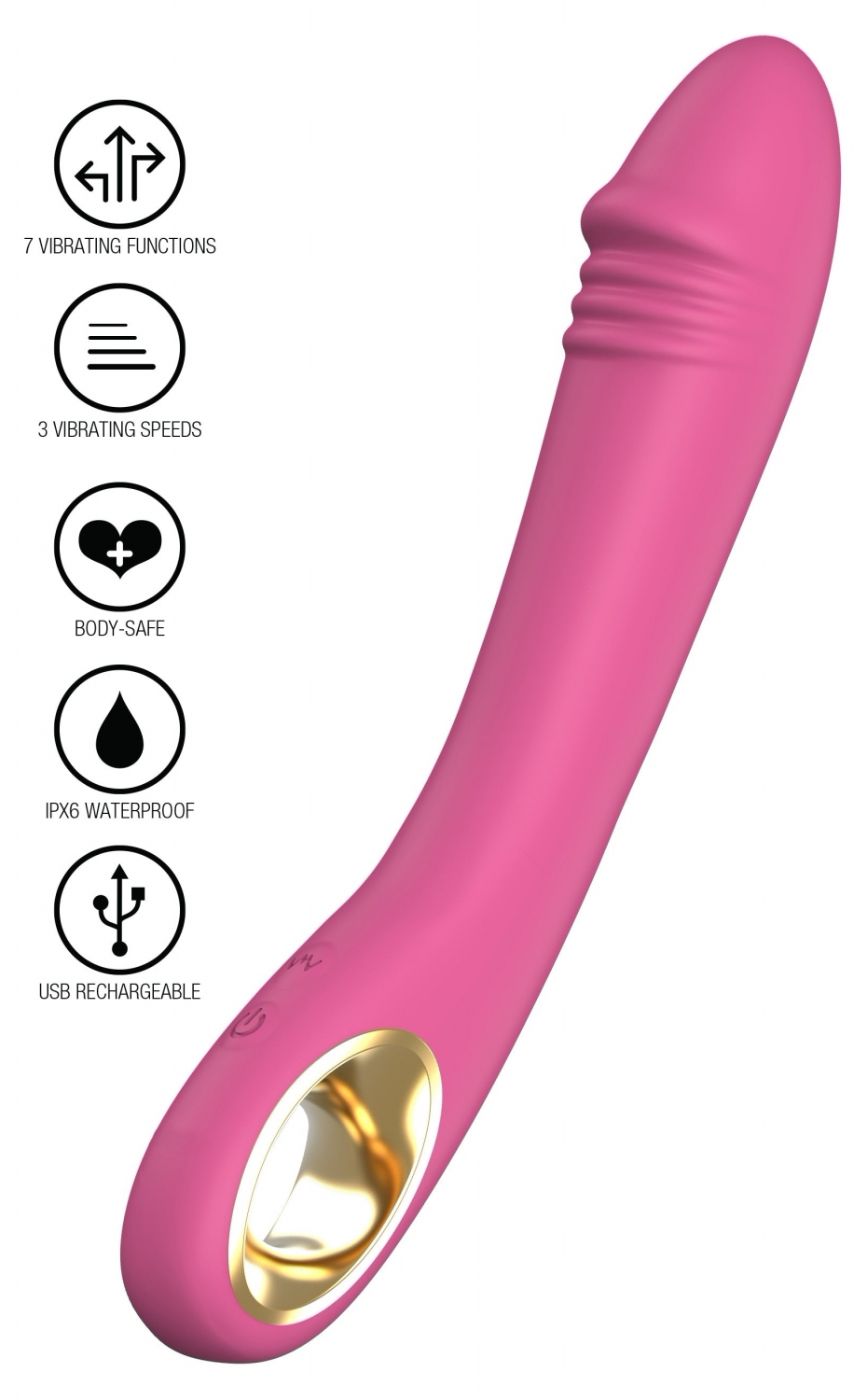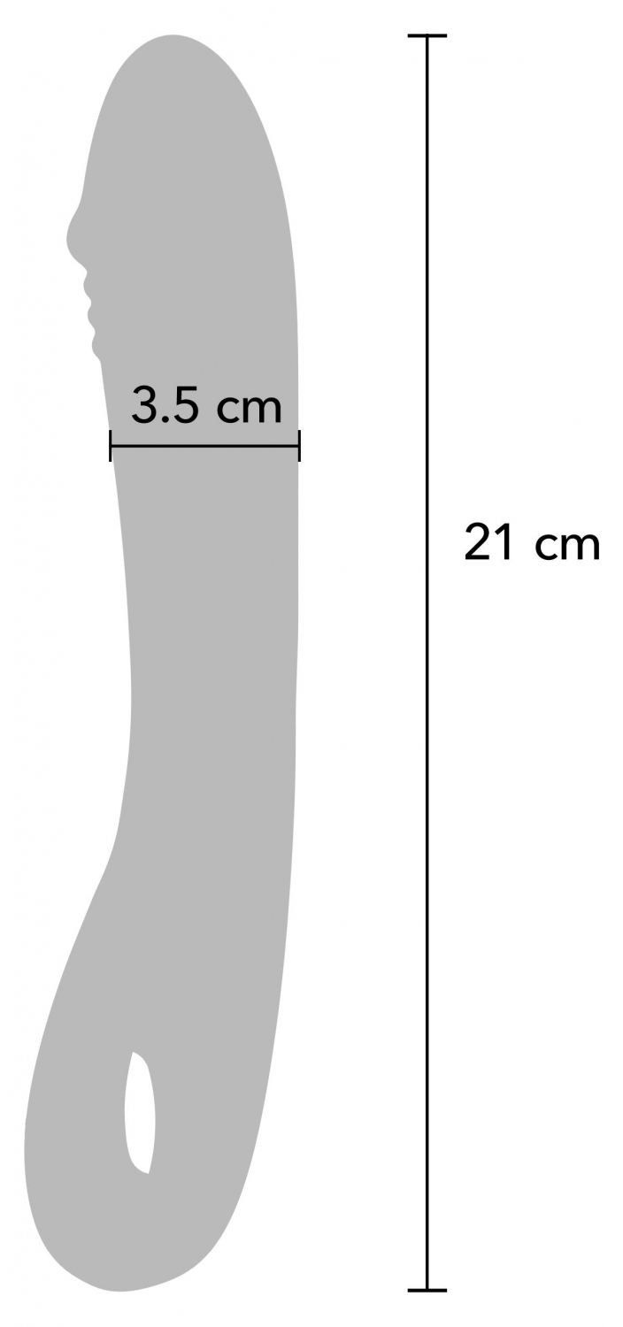 Motorul aproape silențios oferă 10 feluri de vibrație, ușor de selectat prin comenzile intuitive. Este cu acumulator și are protecție IPX6, ceea ce îl face rezistent la apă pentru curățare facilă. Mărimi relevante: extindere totală 21 cm, calibru 5 cm; mărime inserabilă 14 cm, diametru inserabil 3.5 cm.
