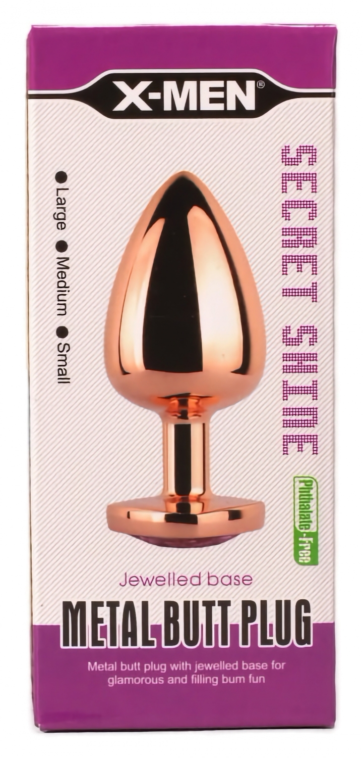 Dop anal metalic X-Men Secret Shine S (7,1 cm). Finisaj rose gold cu ornament în expresie de inimă. Aspect conică pentru dilatare treptată, regiune lucioasă pentru alunecare ușoară și bază texturată pentru stabilitate. Unisex. Spălare facilă; folosiți lubrifiant pe bază de apă.