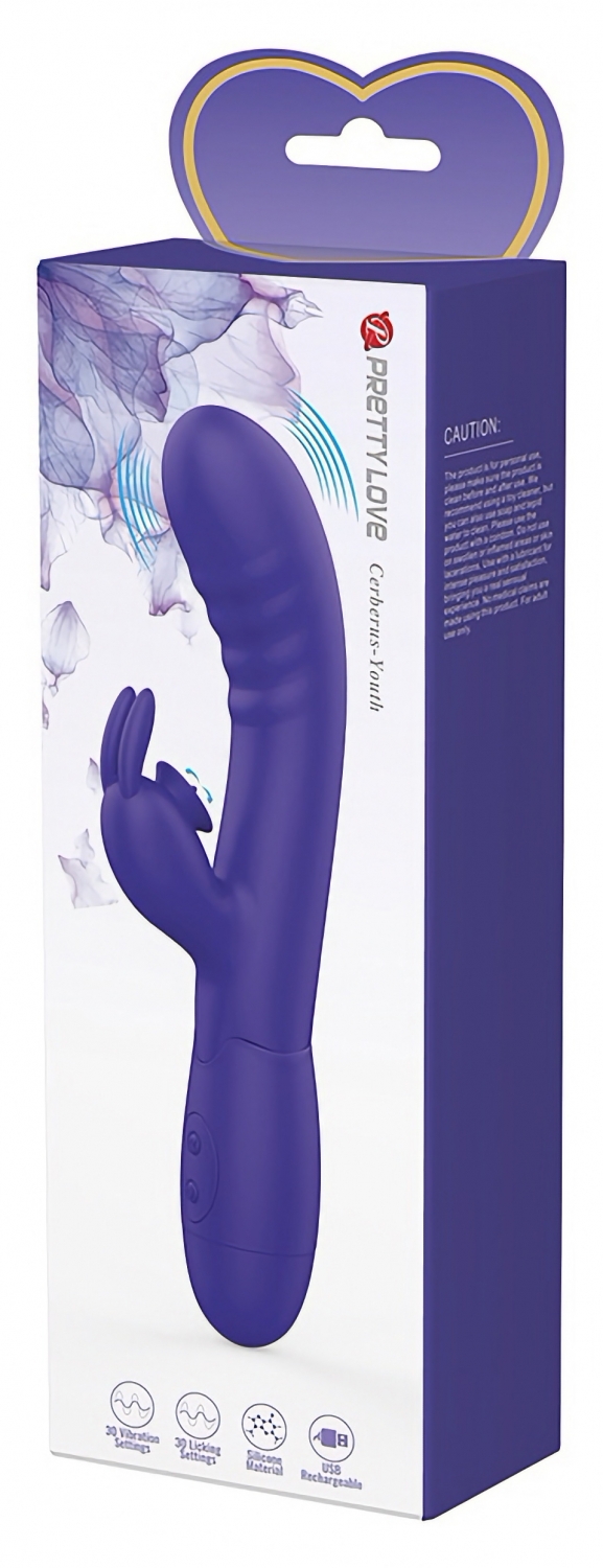 Pretty Love Cerberus Youth este un vibrator tip rabbit, realizat pentru stimulare multiplă și reglaje fine. Capul încovoiat țintește punctul G, iar brațul mic tip iepure transmite contact direct și precis cu clitorisul. Conține de 30 de programe de vibrație pentru a adapta vigoarea după preferințe.