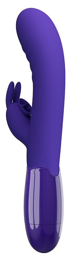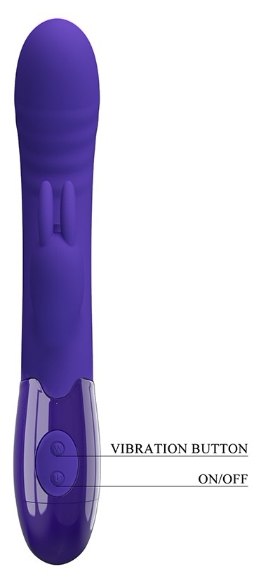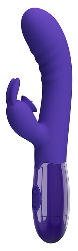 Vibrator iepure Pretty Love Cerberus Youth — silicon velvet + ABS, cap curbat pentru punctul G și braț clitoral pentru stimulare directă. 30 aplicații de vibrație, cu acumulator și trainic la apă. Textură catifelată, stil compact.