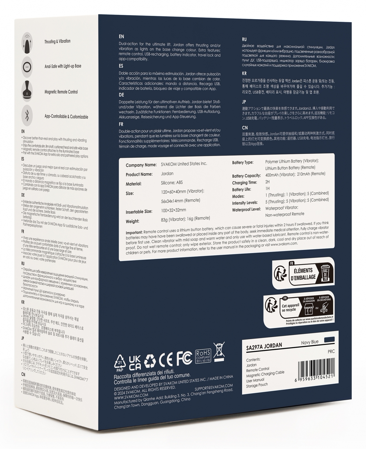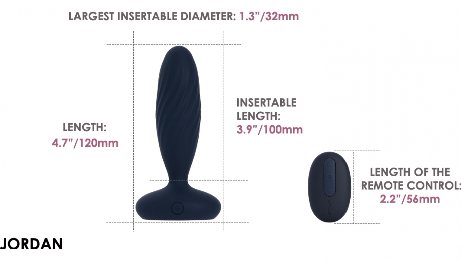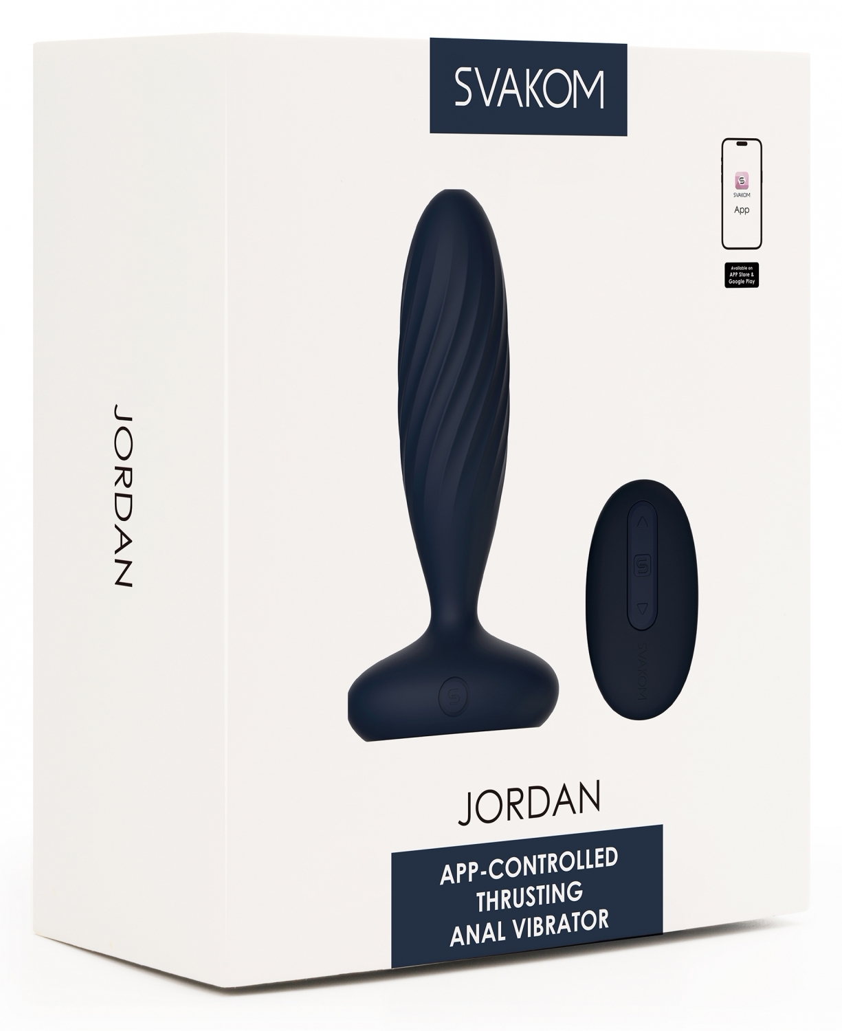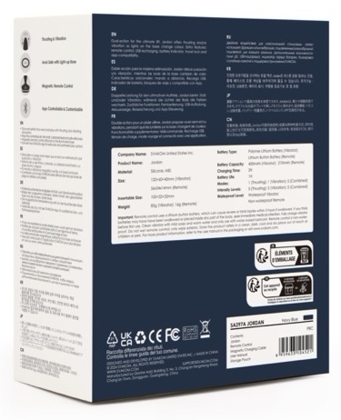Control flexibil: Jordan poate fi operat prin aplicaţia SVAKOM sau cu telecomanda magnetică fixată de bază. Oferă 7 moduri (1 de împingere, 1 de vibraţie şi 5 combinate), fiecare cu 5 niveluri de intensitate. Există şi un mod inteligent care imită ritmuri naturale. Telecomanda nu este rezistentă la apă.