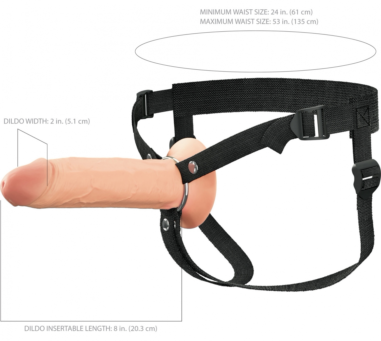 Manson strap-on din silicon dual density, partea interioară gol. Mărime totală 21.6 cm, inserție 20.3 cm. Exterior moale, nucleu ferm, bază flexibilă și ham nylon reglabil cu inel metalic pentru prindere sigură.
