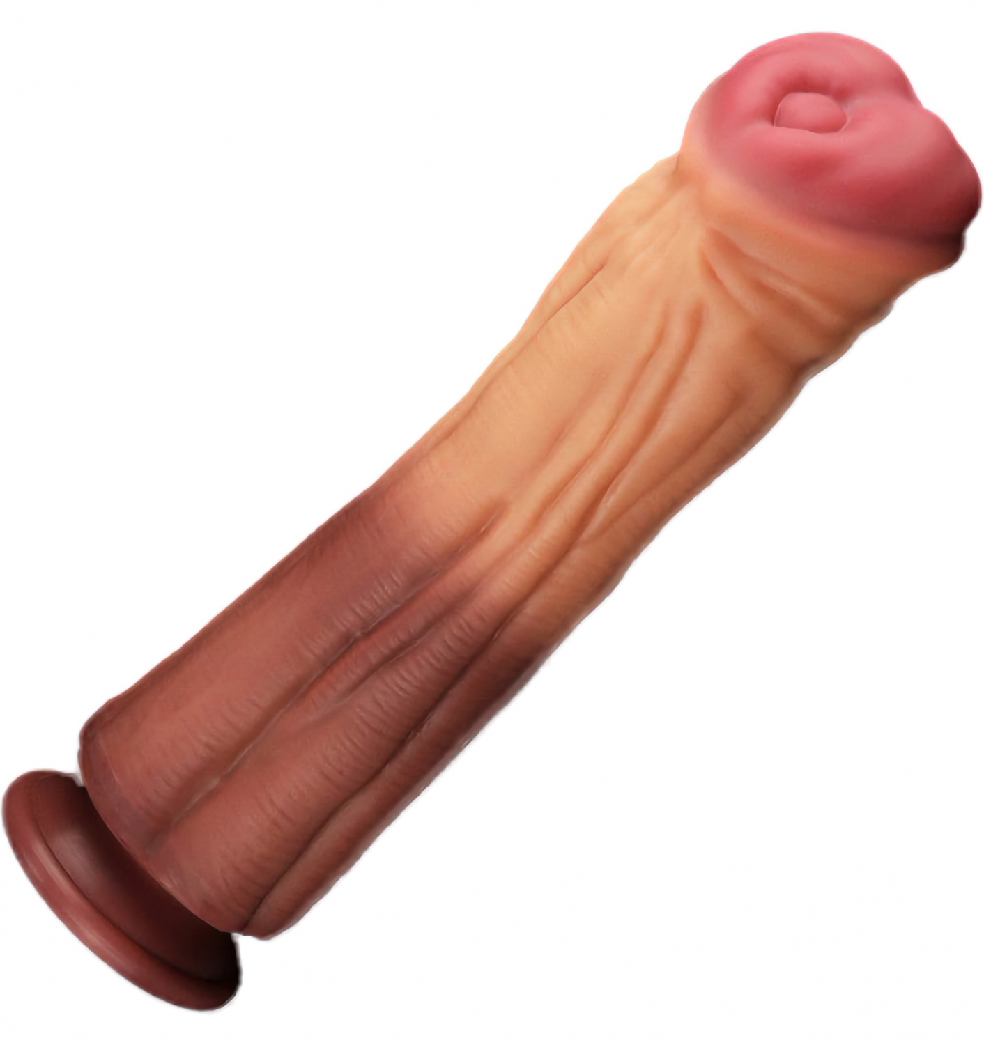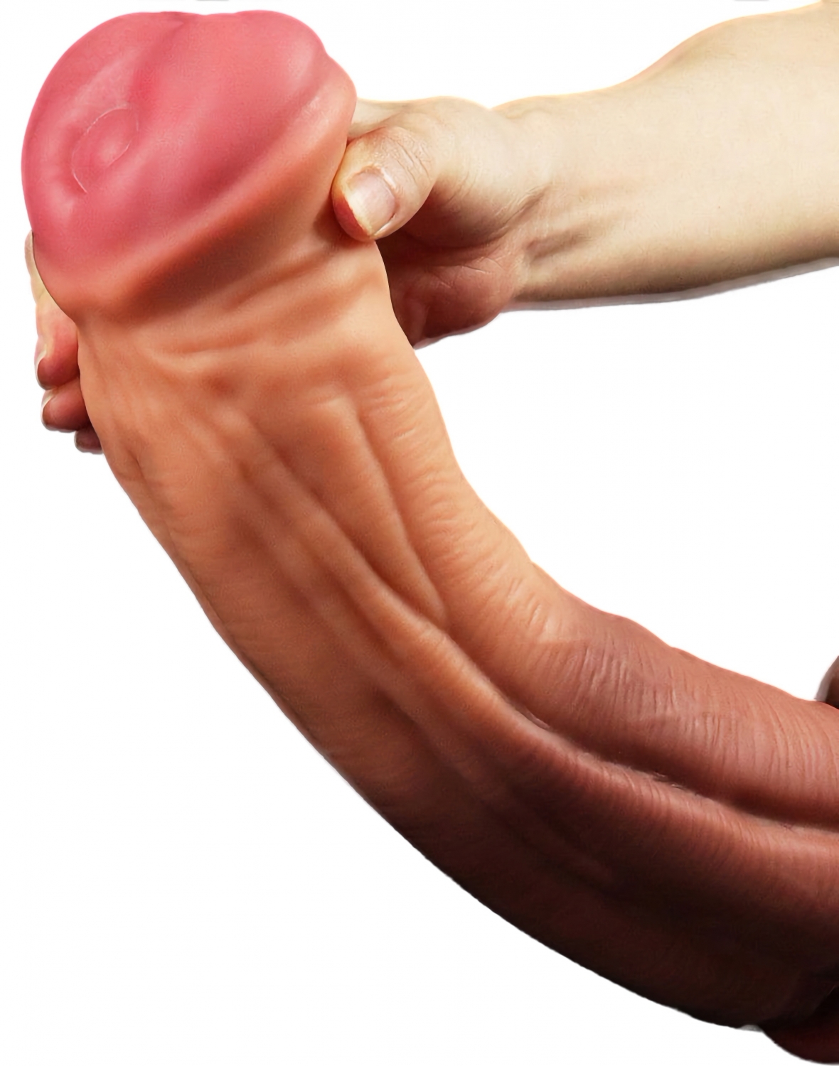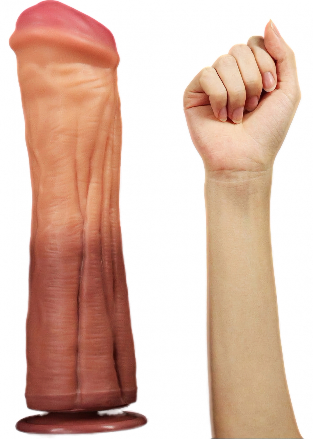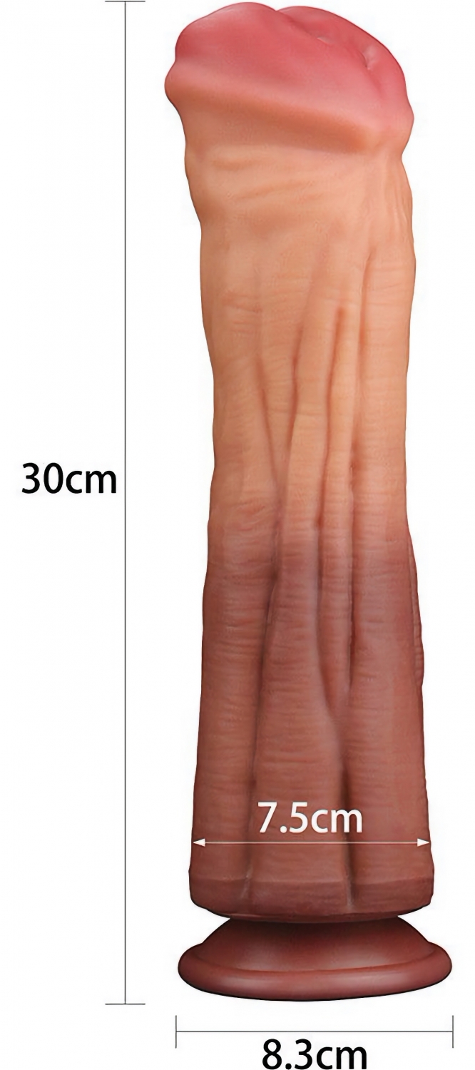 Silicon platinum dublu strat, exterior jelly și nucleu ferm. 30 cm lungime, calibru 7,5 cm. Ventuză puternică pentru utilizare hands-free. Excluzând chimicale periculoase și latex. Ușor de curățat.