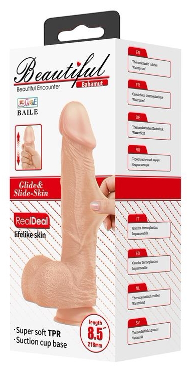 Realist și stabil: Baile Bahamut, 24 cm total, 18 cm inserabili și calibru 5 cm. Textură detaliată pentru senzație normală și ventuză puternică pentru fixaj pe suprafețe netede. Potrivit pentru utilizatori care caută control și varietate de poziții.