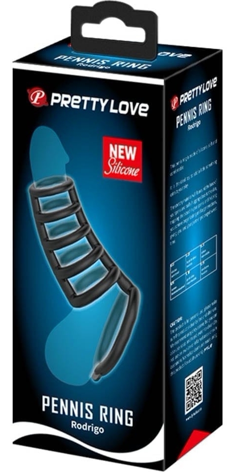 Cilindru din silicon Pretty Love Rodrigo, cu 6 inele şi textură nervurată pentru stimulare suplimentară. Se fixează sub scrot cu bandă stabilizatoare, viguros la apă. Lungime 10 cm, calibru 3.8 cm.