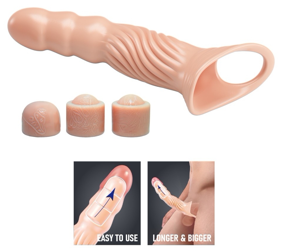 Extensie penian din TPE, ultra-realistă, cu textură venată și cap pronunțat. Curea pentru scrot garantează fixarea. Conține 3 extensii interioare detașabile (1 inch fiecare) pentru reglaj.