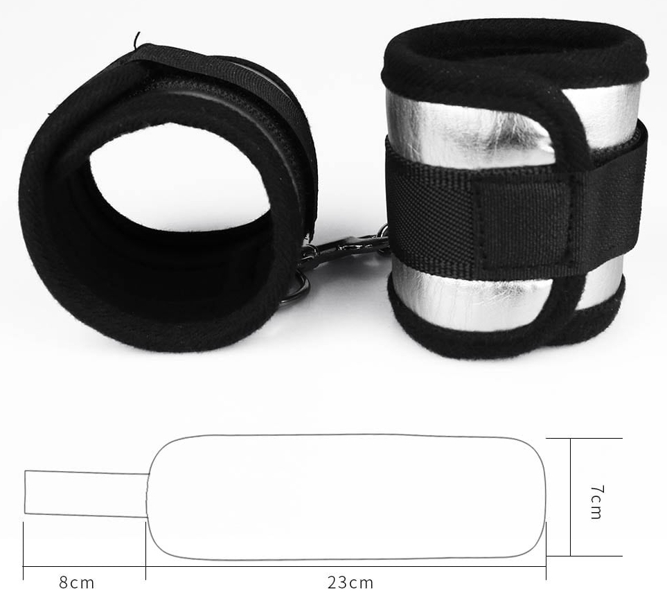 Sistemul de fixare conține cingătoare Velcro rezistente și cleme cu eliberare rapidă, care permit conectarea între manșete sau la alte podoabe cu inele D. Designul adaptiv menține poziția fără a presa excesiv, fiind corespunzător pentru utilizatori neexperimentați sau pentru cei care doresc sesiuni controlate.