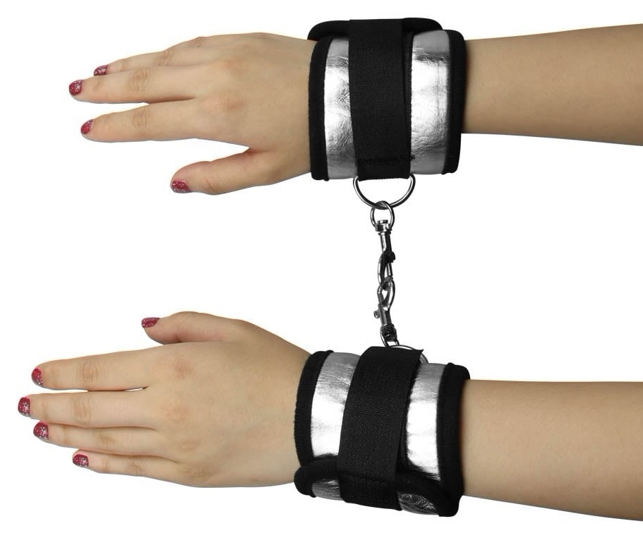 Cătușe moi Lovetoy Struggle: exterior din neopren argintiu, căptușeală din catifea, curele Velcro și cleme rapide pentru conectare la inele D. Confortabile, reglabile și ușor de întrebuințat pentru jocuri de restricție ușoare.