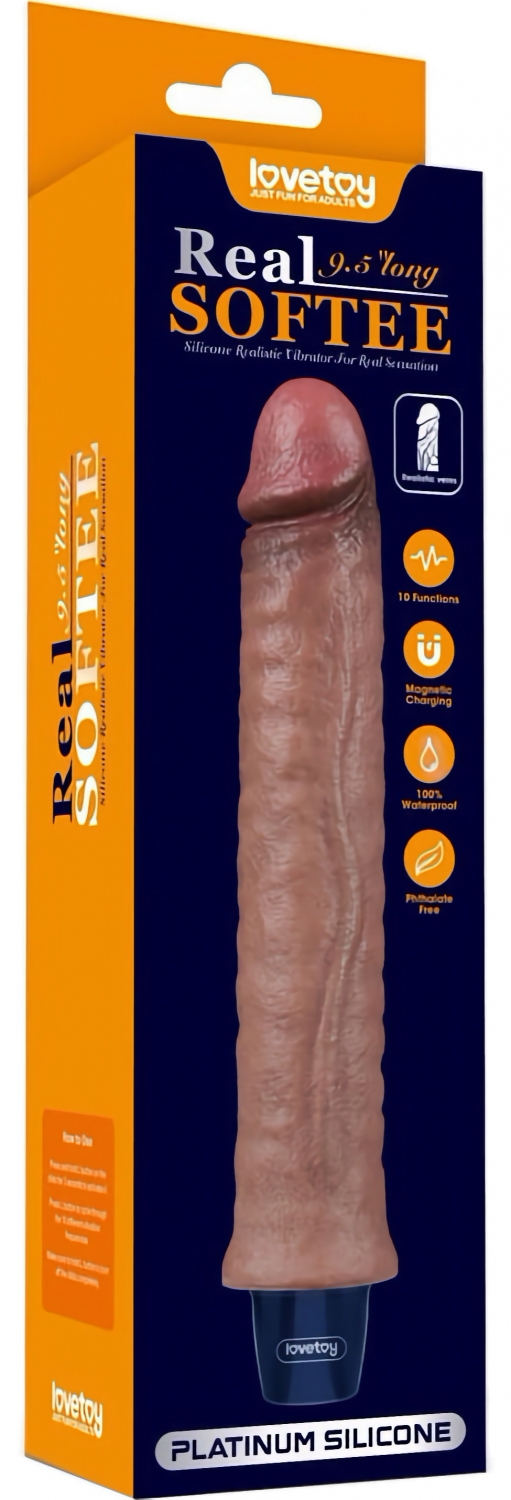 Vibrator Lovetoy Real Softee, din silicon platinum, 24,5 cm, cu 10 chipuri de vibrație. Motor silențios, 100% impermeabil și reîncărcabil USB. Textură moale și cap proeminent pentru stimulare precisă; zămislit pentru utilizare discretă.