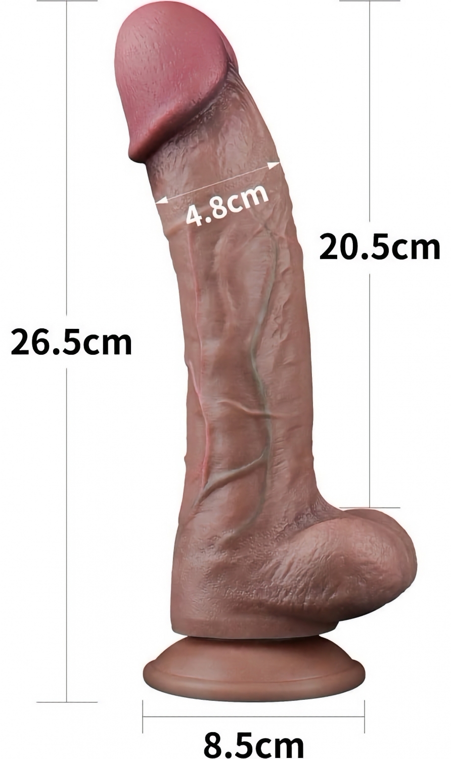 Dildo realist din silicon platinum, dublu strat, cu miez ferm pentru senzaţie naturală. Extindere 26,5 cm, diametru 4,8 cm. Ventuză pentru utilizare hands-free. Fără ftalaţi şi latex; se propune material lubrifiere pe bază de apă.