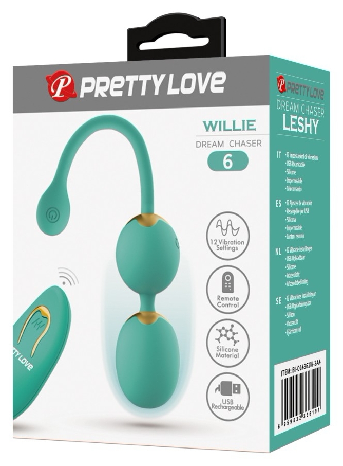 Bile Kegel Pretty Love Willie Green cu tele-comandă și 12 moduri de vibrație pentru tonifierea mușchilor pelvieni. Estetică discret, ușor de folosit, ideal pentru exerciții regulate acasă sau în deplasare.