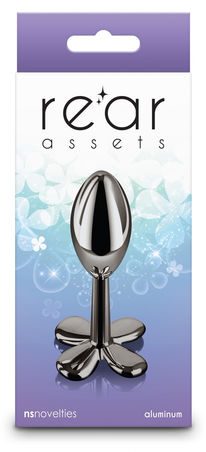 Rear Assets Clover — dop anal din aluminiu cromat, ușor și rezistent la apă. Diametru 3,7 cm, lungime 9,2 cm. Estetică conturat pentru introducere confortabilă. Compatibil cu toți lubrifianții; finisaj gunmetal, grațios și practic.