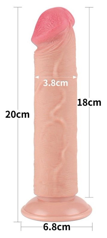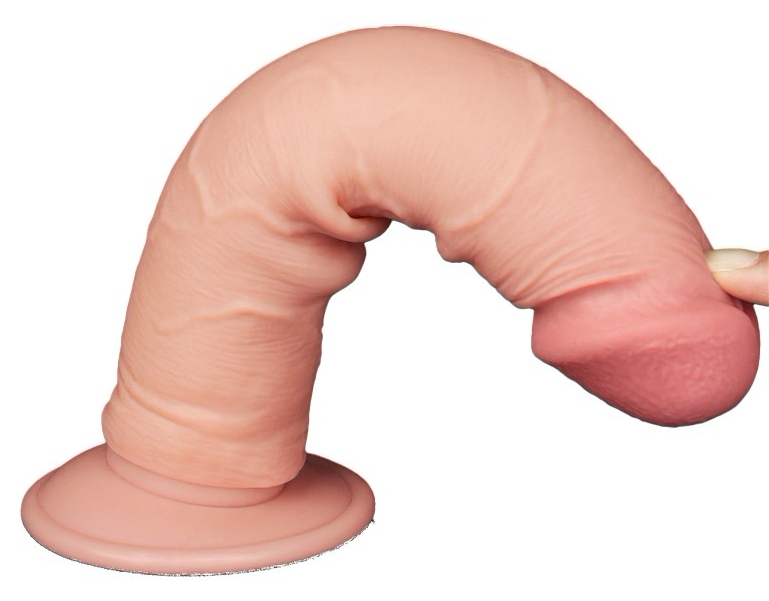 Dildo LoveToy Sliding Skin 20 cm din TPE dual-layer: exterior moale și miez ferm pentru senzație naturală. Flexibil, cu ventuză detașabilă pentru hands-free. Se curăță ușor; uzați lubrifiant pe bază de apă.