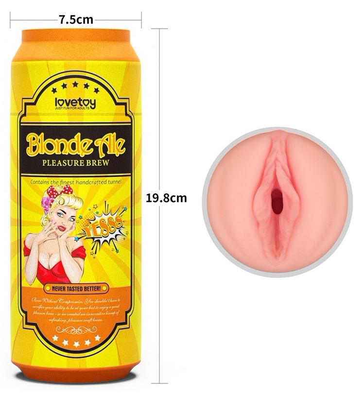 Masturbator compact LoveToy Pleasure Brew Blond Ale, din TPE moale şi flexibil, cu tunel texturat (ridicături, nodule şi inele). Mărime totală 19.8 cm, calibru aprox. 7.8 cm. Fără ftalaţi şi latex. Curăţare uşoară; recomandat lubrifiant pe bază de apă.