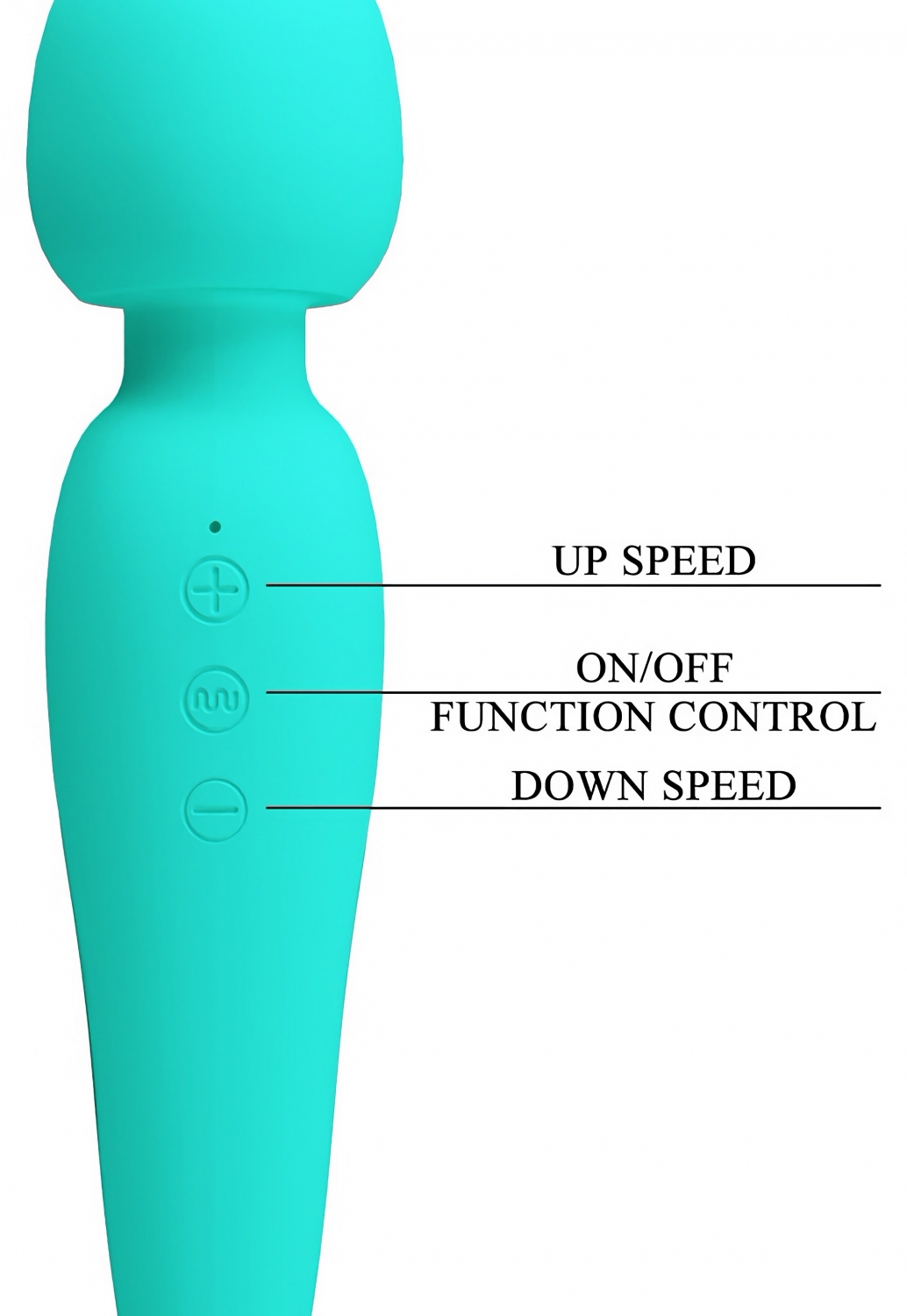 Vibrator tip wand Pretty Love Meredith, cu cap din silicon moale, 7 moduri de vibrație, 100% rezistent la apă și reîncărcabil. Compact (Ø5×21,5 cm), ușor de mânuit și cu control intuitiv pentru ajustare rapidă a intensității.