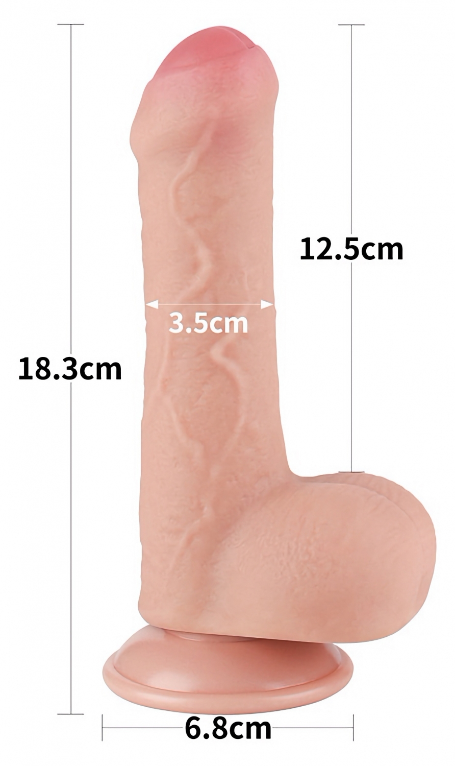 Material TPE cu două straturi: exterior fin și nucleu ferm pentru senzație realistă. 18,3 cm lungime, calibru 3,5 cm. Ventuză detașabilă, aferent cu lubrifianți pe bază de apă. Curățare simplă.