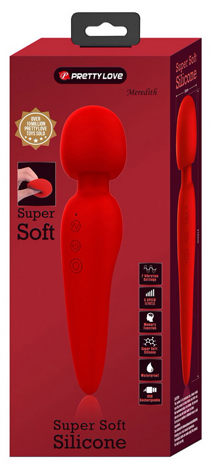 Wand Pretty Love Meredith: cap maleabil din silicon moale, 7 moduri de vibraţie, reîncărcabil şi 100% viguros la apă. Compact (21.5 cm) şi uşor de manevrat — ideal pentru baie sau duş.