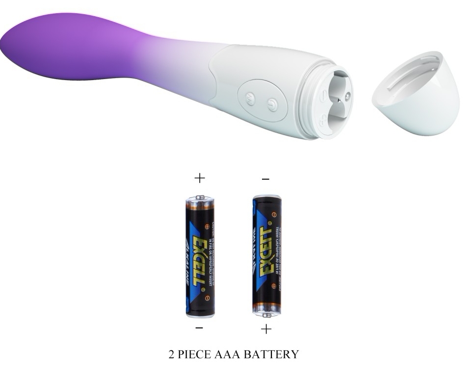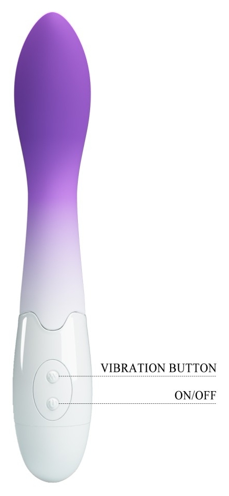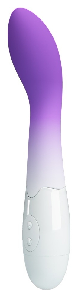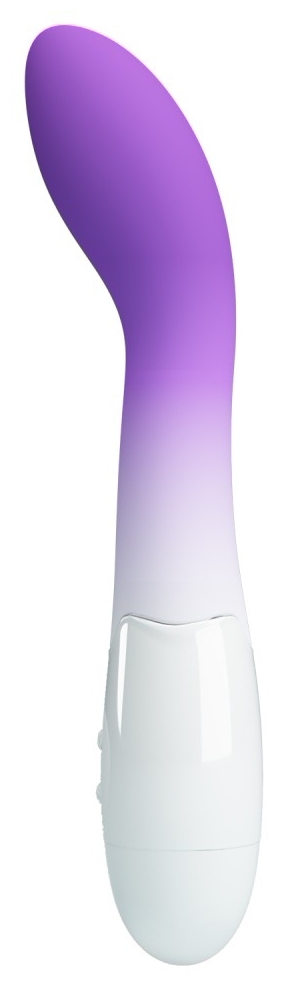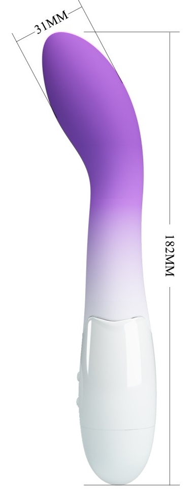Vibrator curbat Pretty Love Bishop, conceput pentru stârnire precisă a punctului G. Cap rotund ușor bombat, formă ergonomică și 30 feluri de vibrație pentru ajustare fină. Tentă mov și alb; adecvat pentru neexperimentați și avansați.