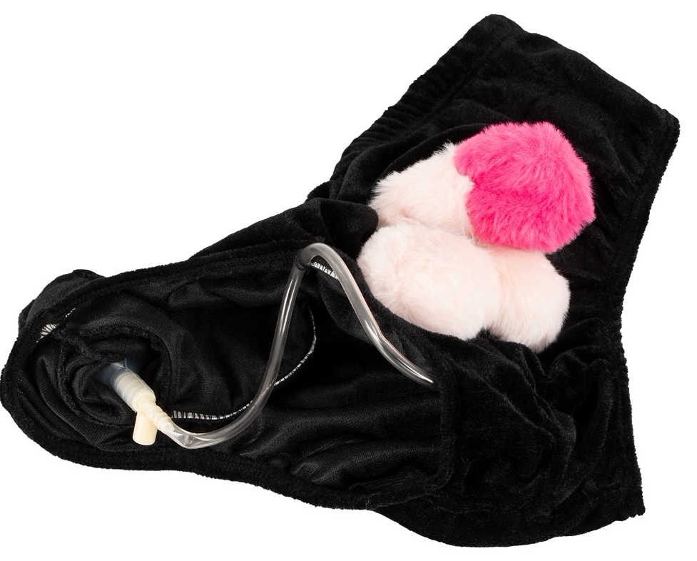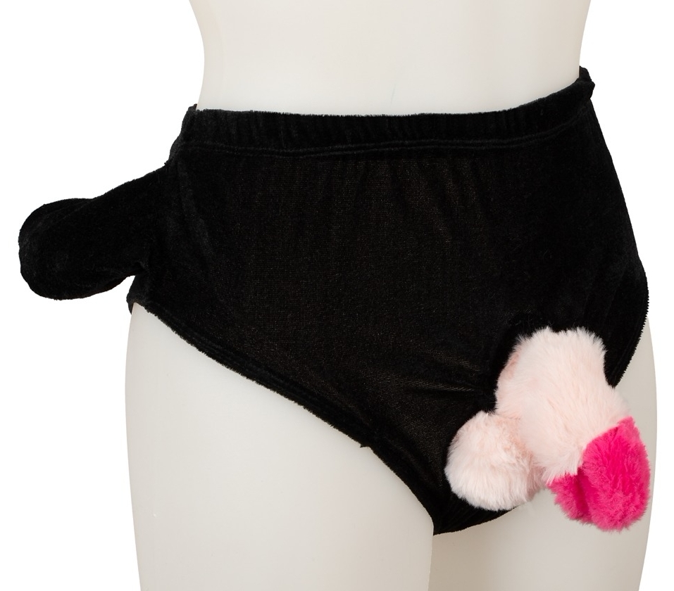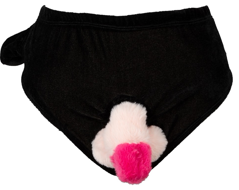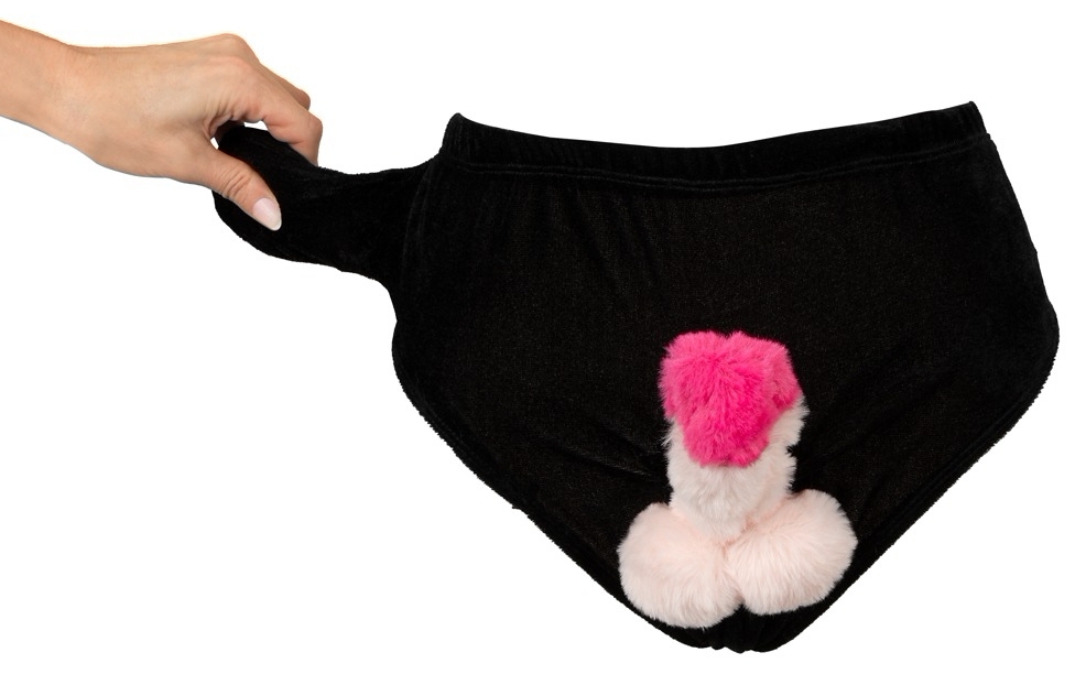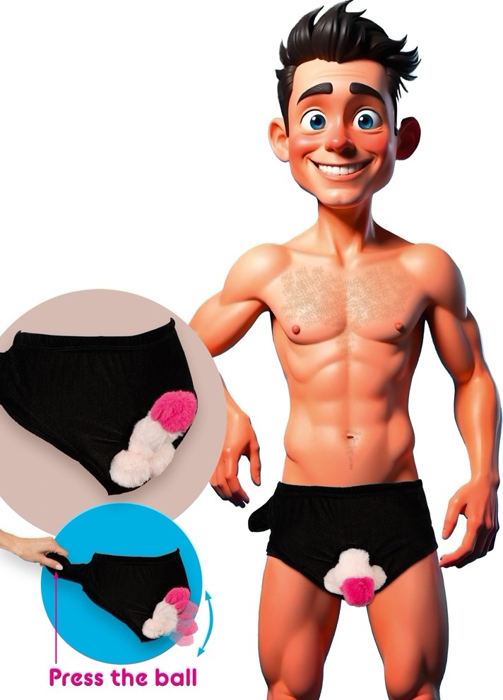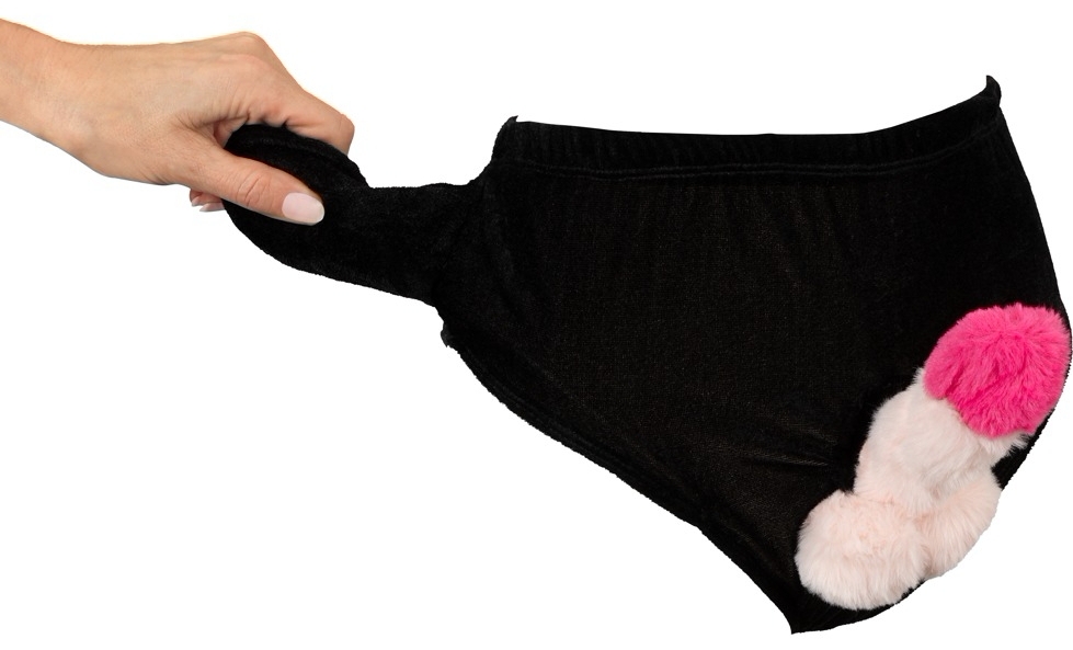 Boxeri negri cu element plușat gonflabil — un obiect de divertisment care atrage privirile. Membrul din pluș poate fi umflat rapid cu ajutorul bilei‑pompă ascunse, oferind un concluzie amuzant și clar vizibil. Măsură unică, material moale 100% poliester.